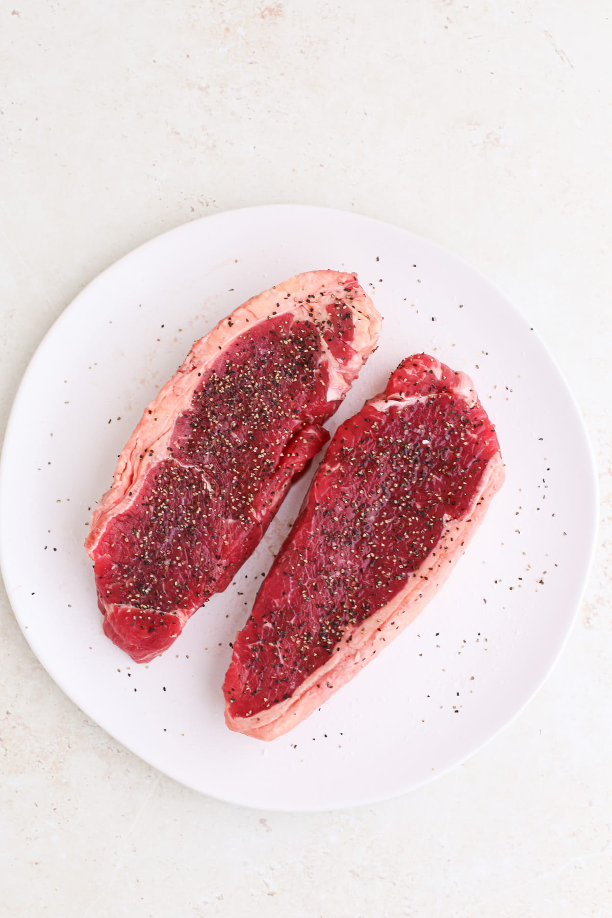 - Season steak. Take the steak out of the fridge about 30 minutes before you plan to cook it and place it on a plate or cutting board. Season each steak generously on both sides with kosher salt and black pepper. Set aside.