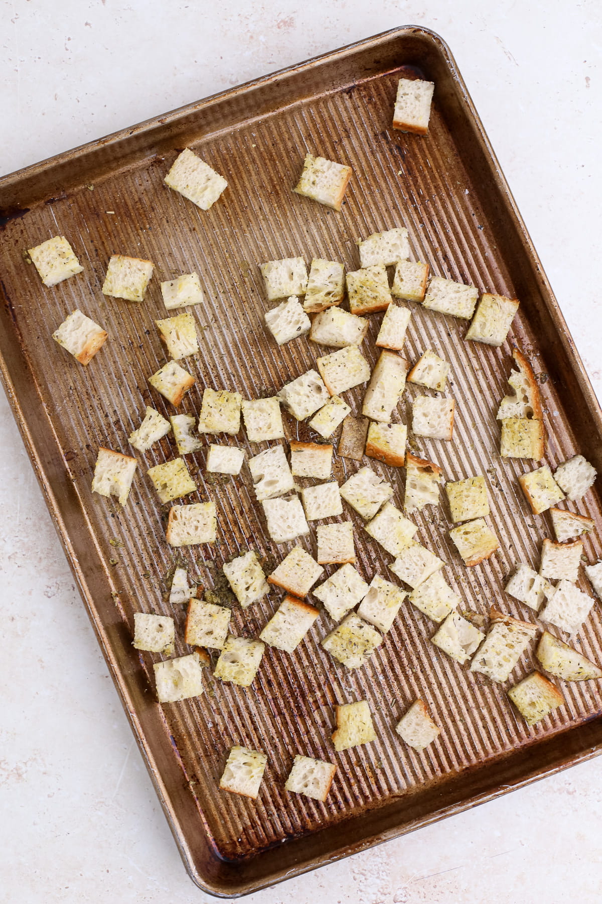 - Make croutons. Preheat oven to 425ºF. Toss the cubed bread on a bare baking sheet with olive oil and the seasonings until evenly distributed then arrange them into a single layer.