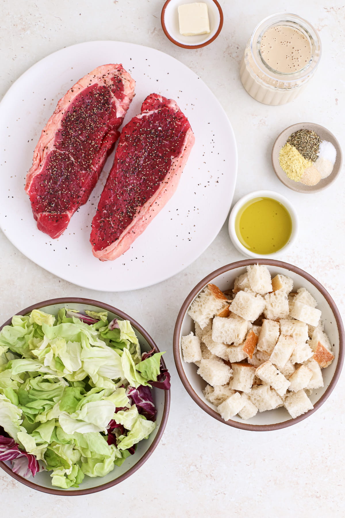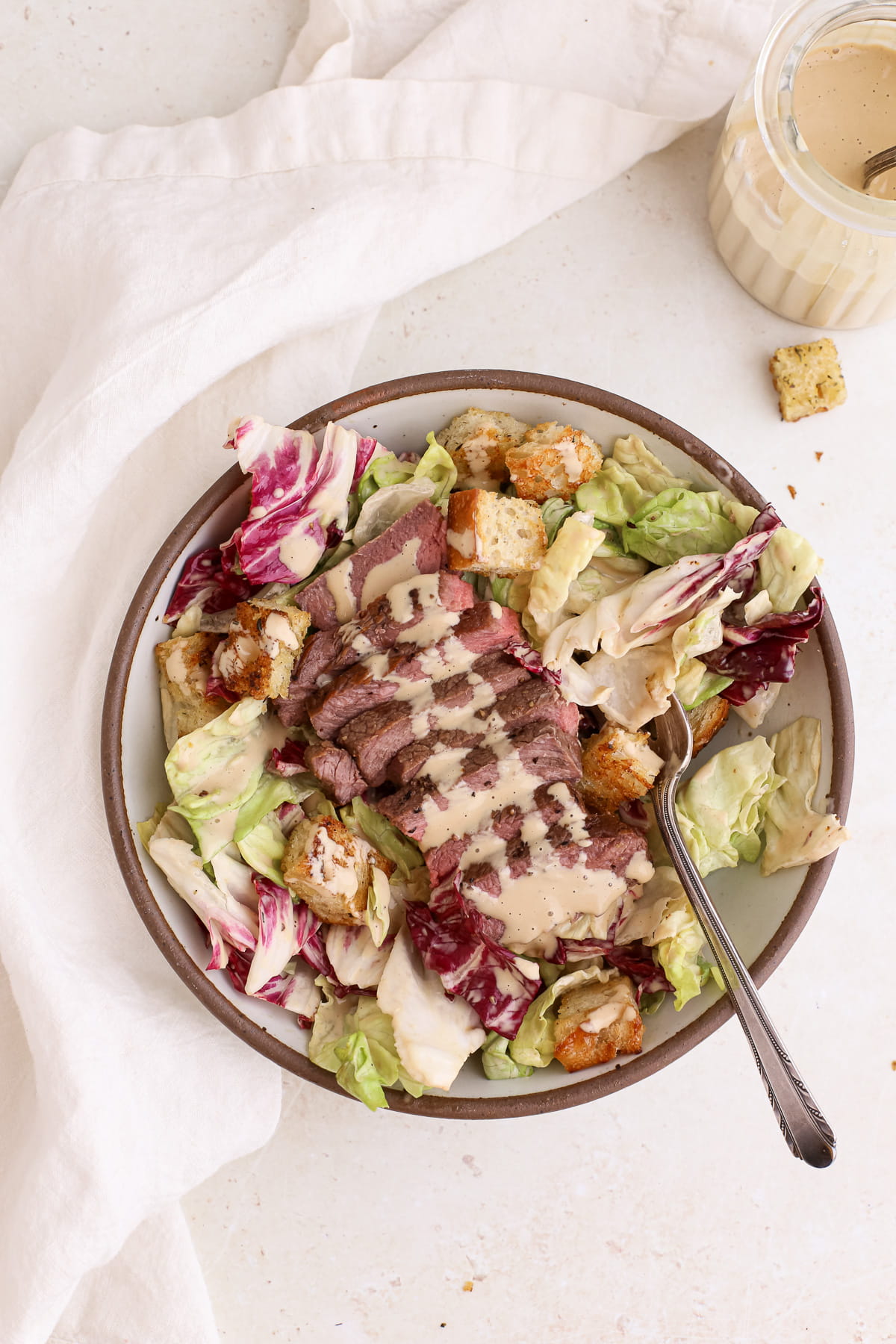 - Plate. Add the dressed lettuce and croutons to each bowl and top with sliced steak and another drizzle of dressing if desired. Enjoy!