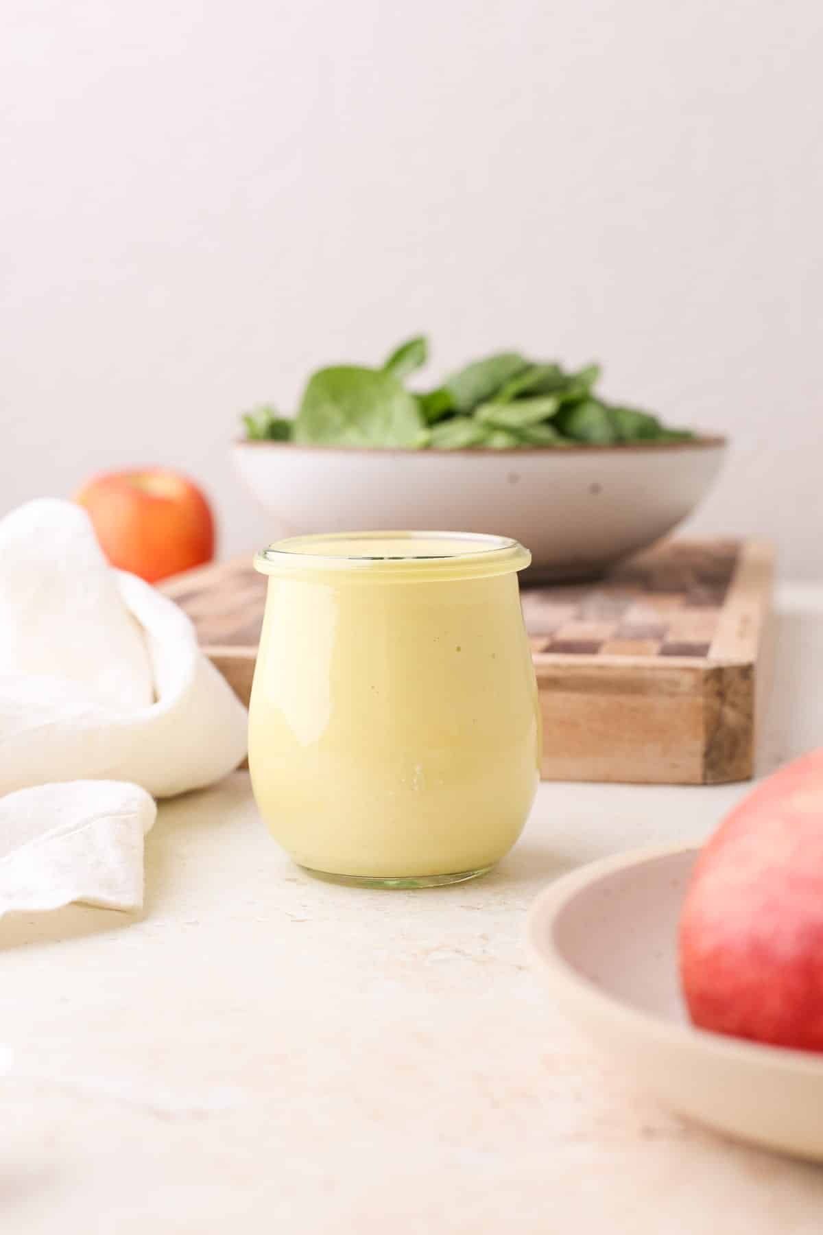 1. Blend. Add all the dressing ingredients to a blender. Blend until smooth and season to taste with kosher salt. If your apple is more tart, add one to two teaspoons of maple syrup or honey.