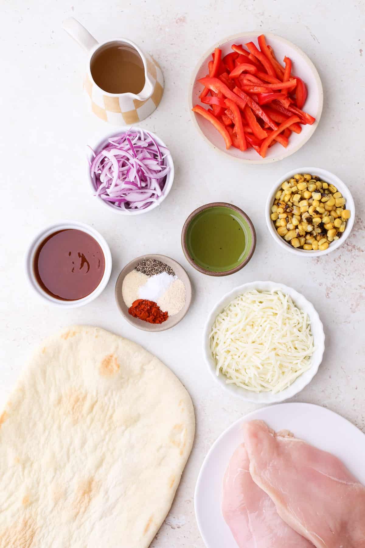 Here’s what you’ll need to make this bbq chicken flatbread pizza: