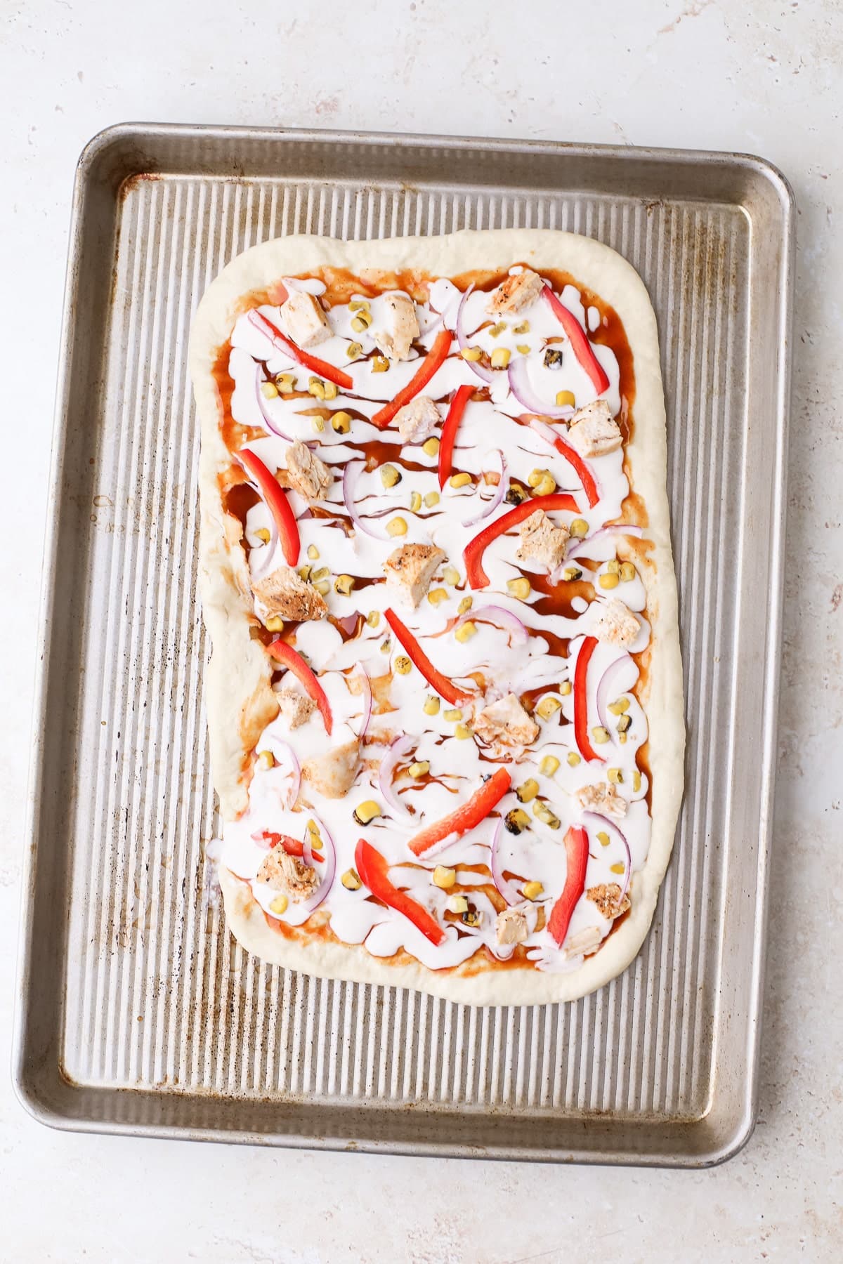 - Assemble flatbread. Add the flatbreads to an unlined baking sheet. Spoon ¼ cup of bbq sauce onto each flatbread, leaving about ½-inch space around the edges. Then top with mozzarella cheese, roasted corn kernels, red bell pepper, sliced red onion, and chicken pieces.