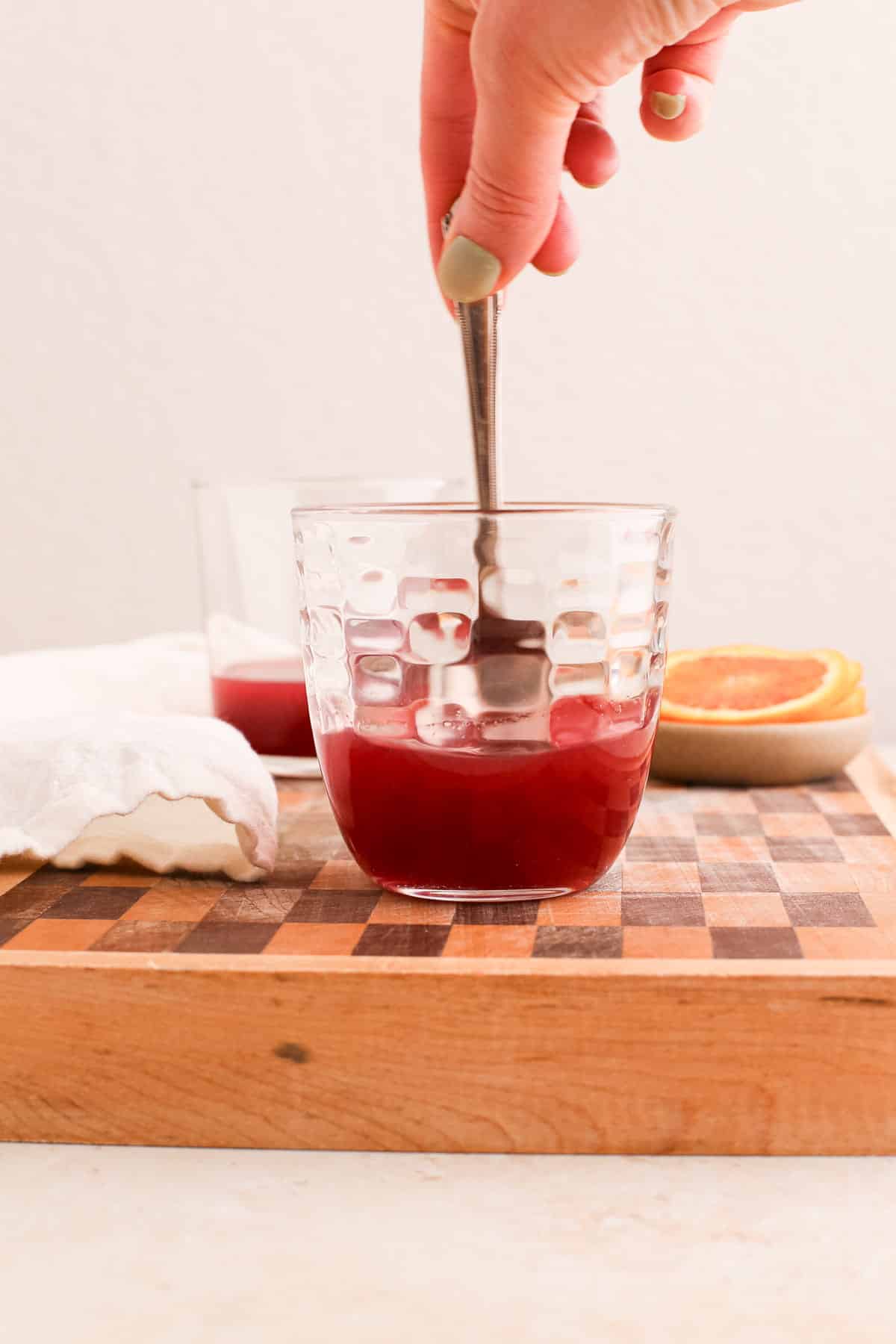 - Mix juice and syrup. Mix the freshly squeezed blood orange juice and hibiscus simple syrup in the bottom of a lowball glass until well combined.