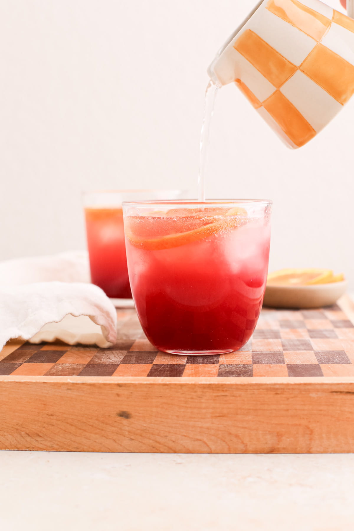 - Add ice and bubbles. Add ice and fill the glass the rest of the way with sparkling water. Garnish with a blood orange slice or some dried hibiscus tea leaves on top.