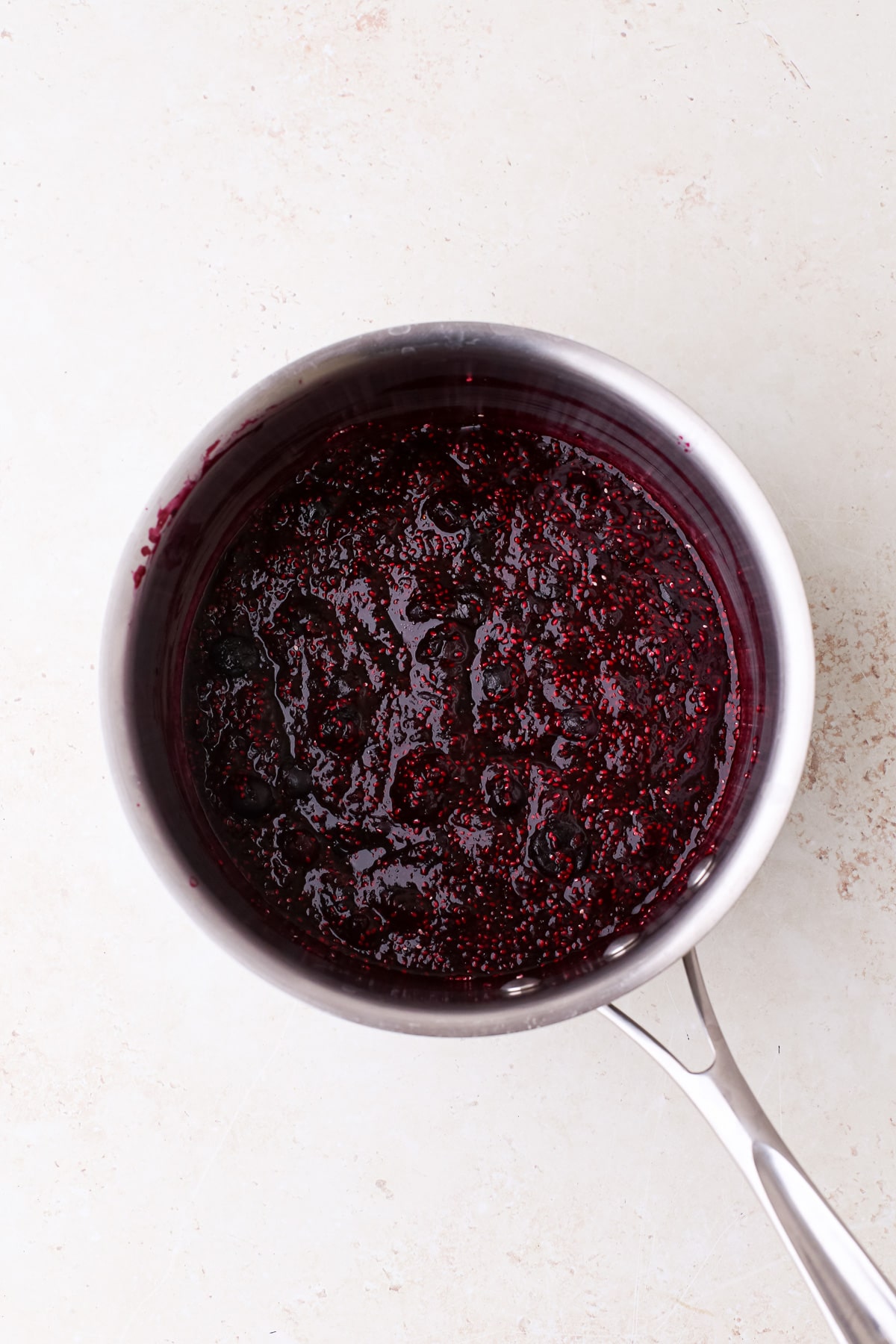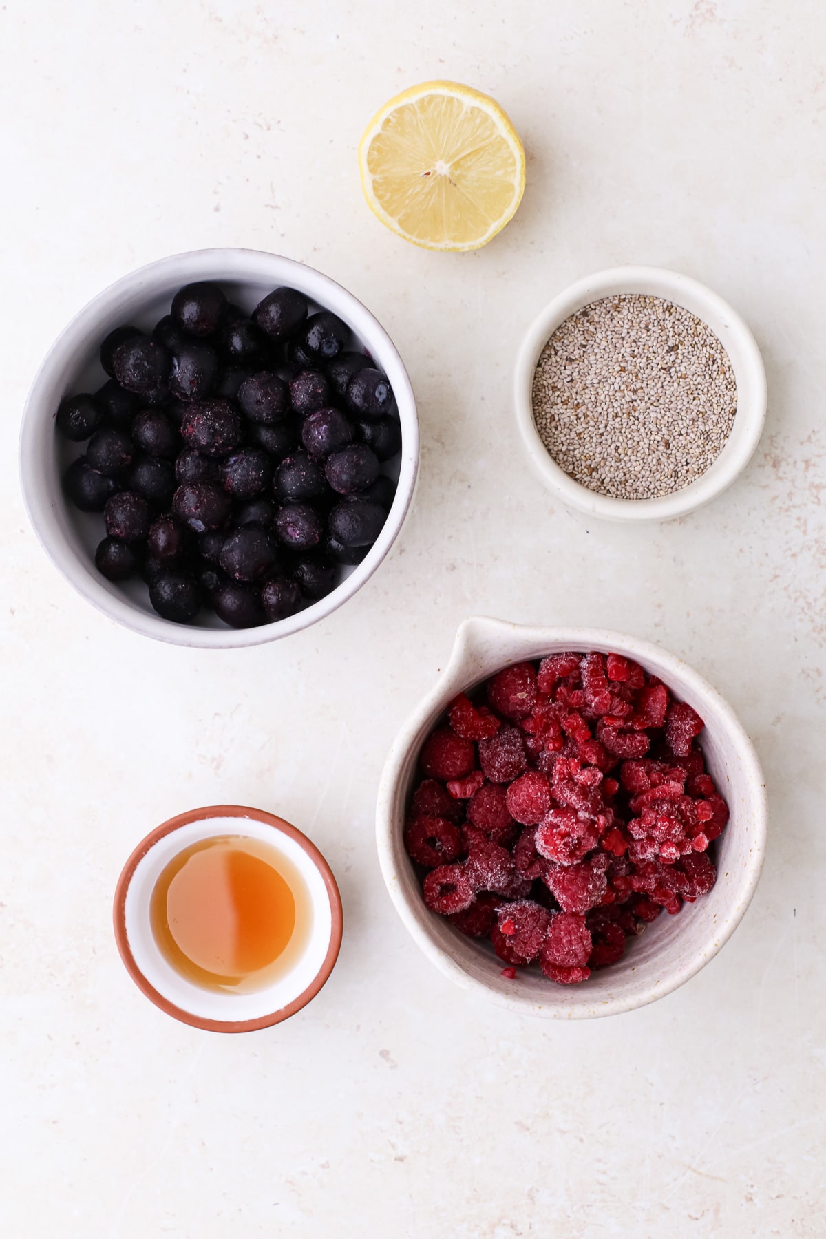 1. Cook berries. Add blueberries, raspberries, lemon juice, and maple syrup to a medium saucepan over medium heat. Cook, stirring occasionally, until the fruit starts to break down and release some of its juices.