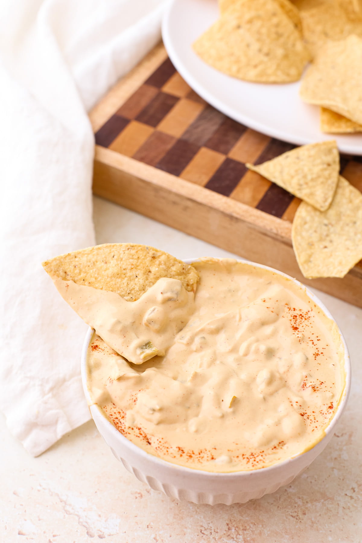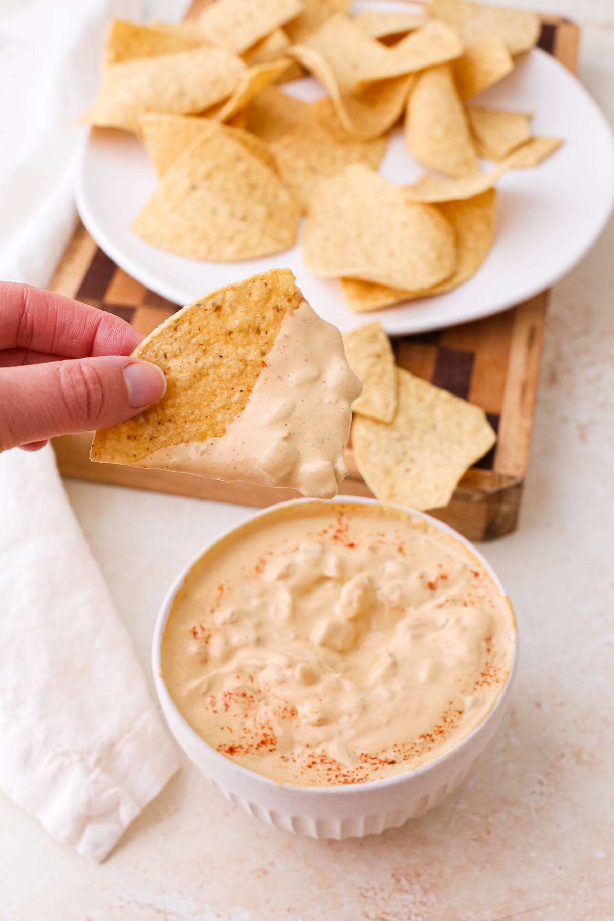 It’s most loved as a dip with chips, however, you can also use it to make dairy free crunchwrap supremes, serve with burrito bowls, for taco night either with taco rice bowls, taco salad bowls, taco soup, or crispy baked tacos, drizzled over refried beans or black beans, or any way you’d enjoy Mexican food.
