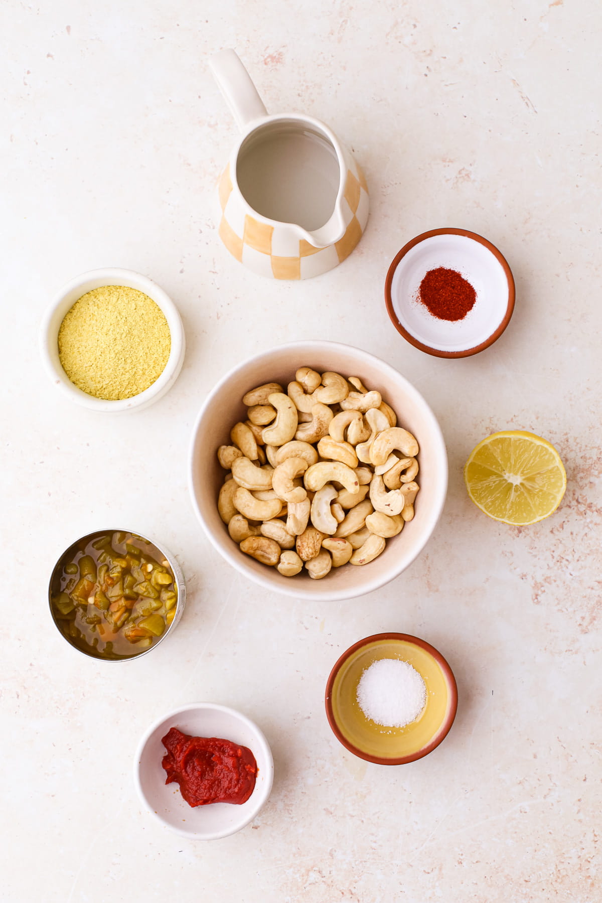 - Add to blender. Add the drained and rinsed soaked cashews to a blender with fresh water, nutritional yeast, lemon juice, tomato paste, salt, smoked paprika, and the chile juice from both cans (set the diced green chiles aside for now).