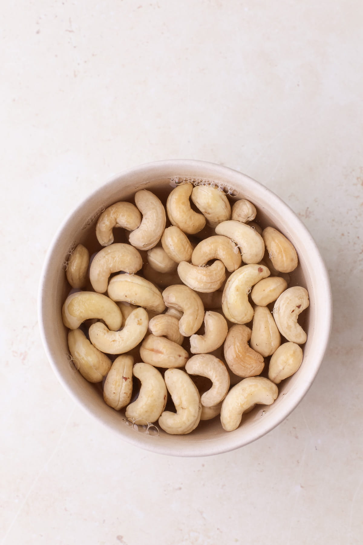 - Soak cashews. Cover the cashews with boiling water and let them soak for 20 minutes to soften. Drain and rinse.