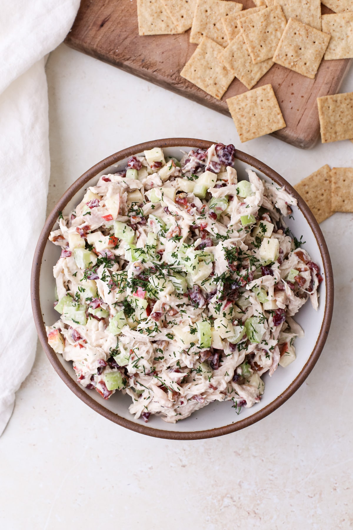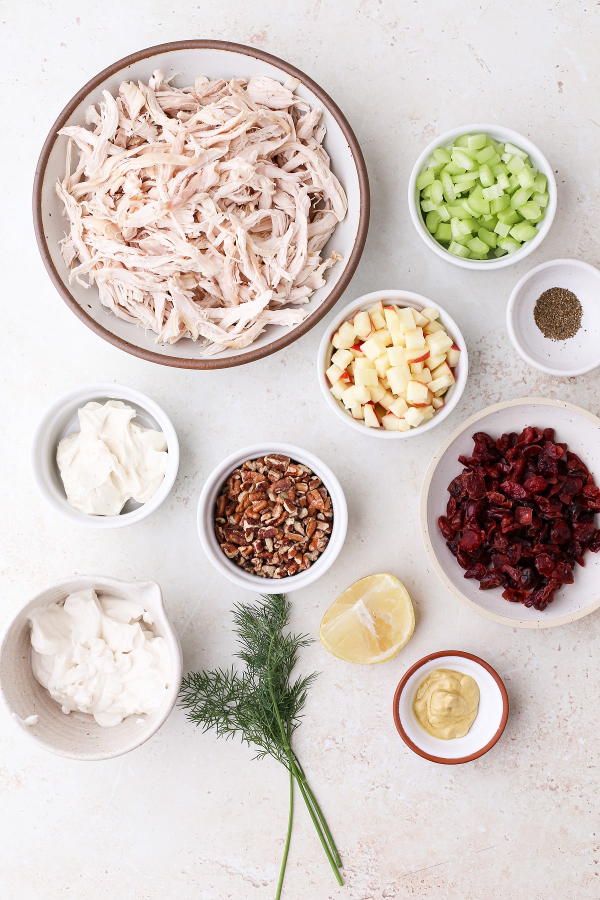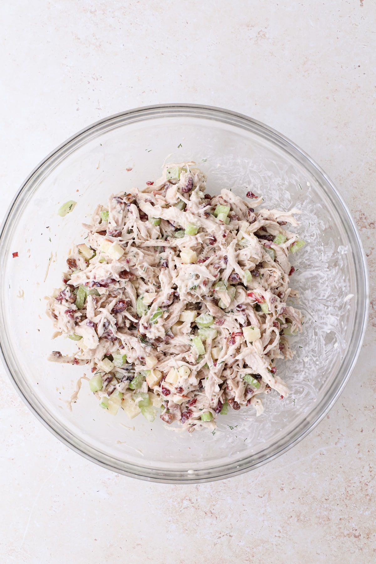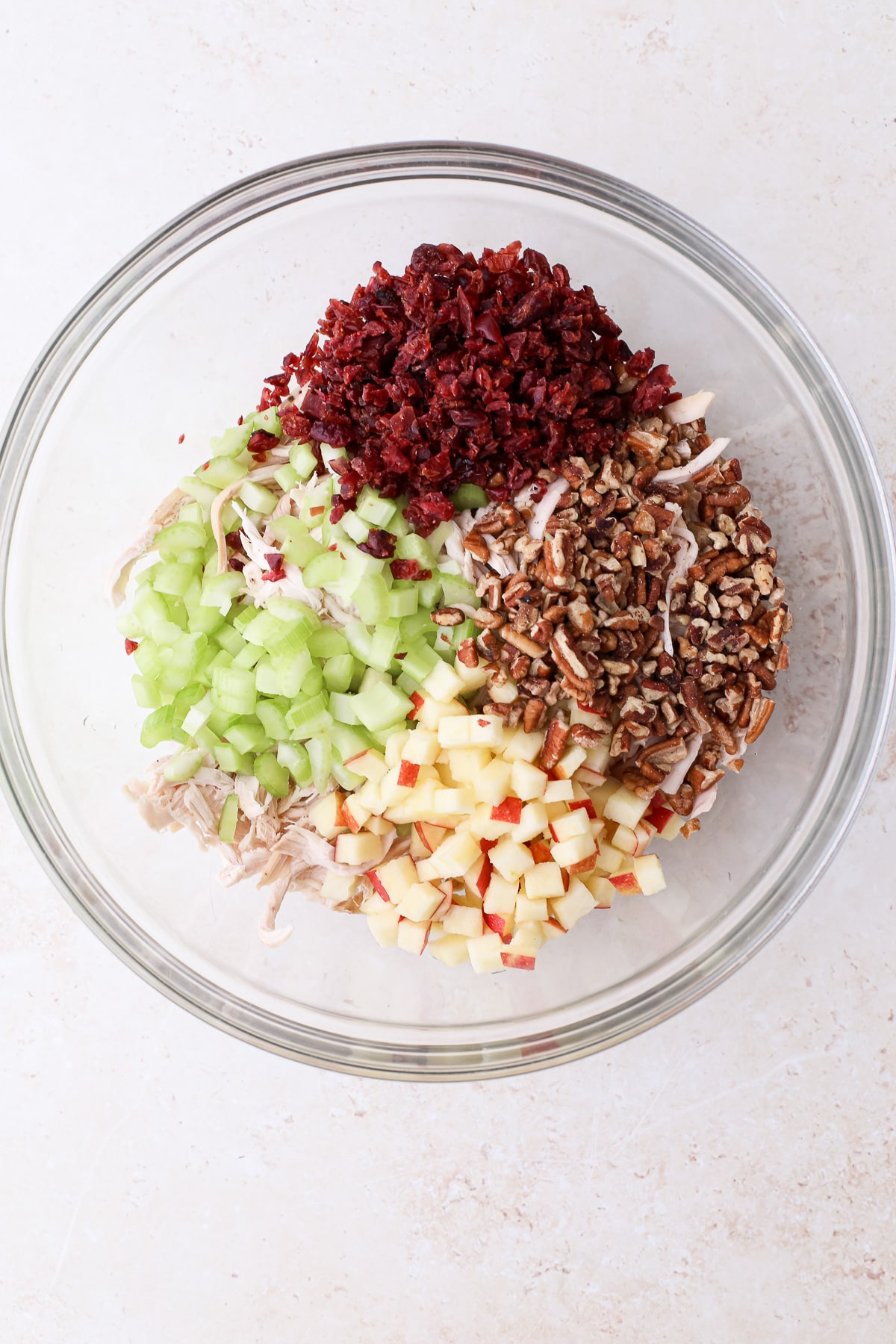 - Make salad. In a large bowl, combine shredded chicken, diced celery, diced apple, chopped dried cranberries, and crunchy pecans.
