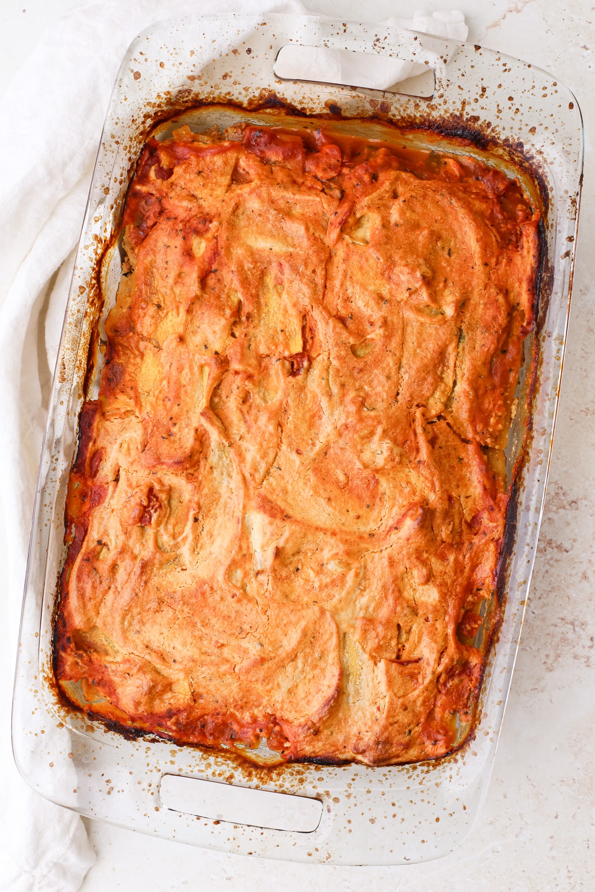 - The cashew ricotta on top forms on a crust once baked that helps keep it together and adds both an incredible flavor and a great texture.