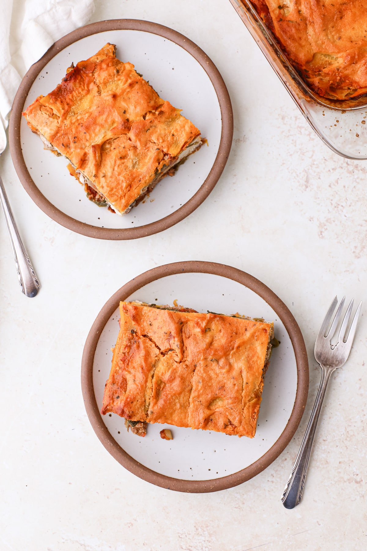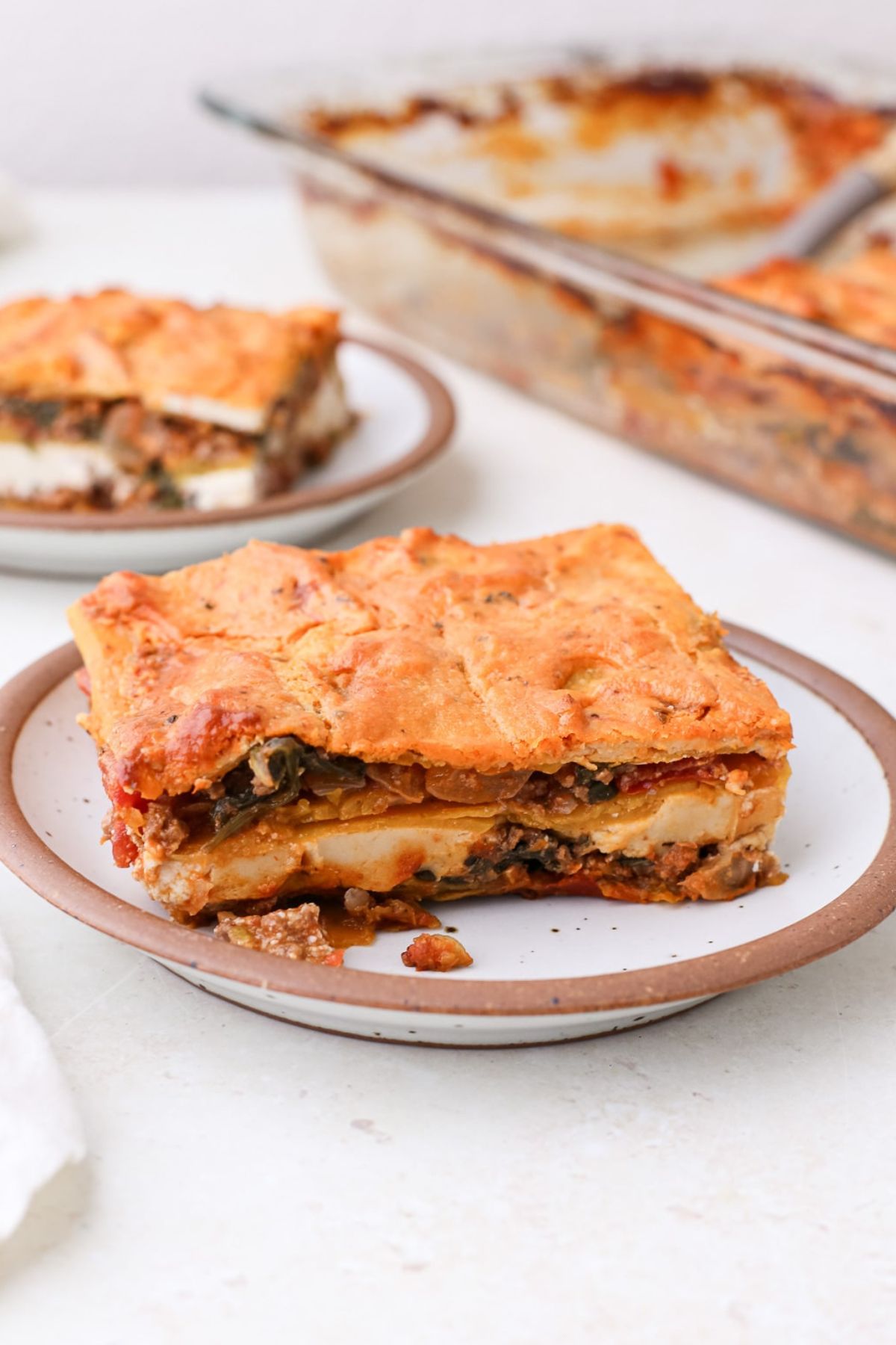 This dairy free lasagna is packed full of vegetables and is a complete meal on its own. However, if you wanted to serve it with a side dish, I’d recommend choosing something with a similar flavor profile such as Italian green bean salad, Italian artichoke salad, or Mediterranean cucumber salad.