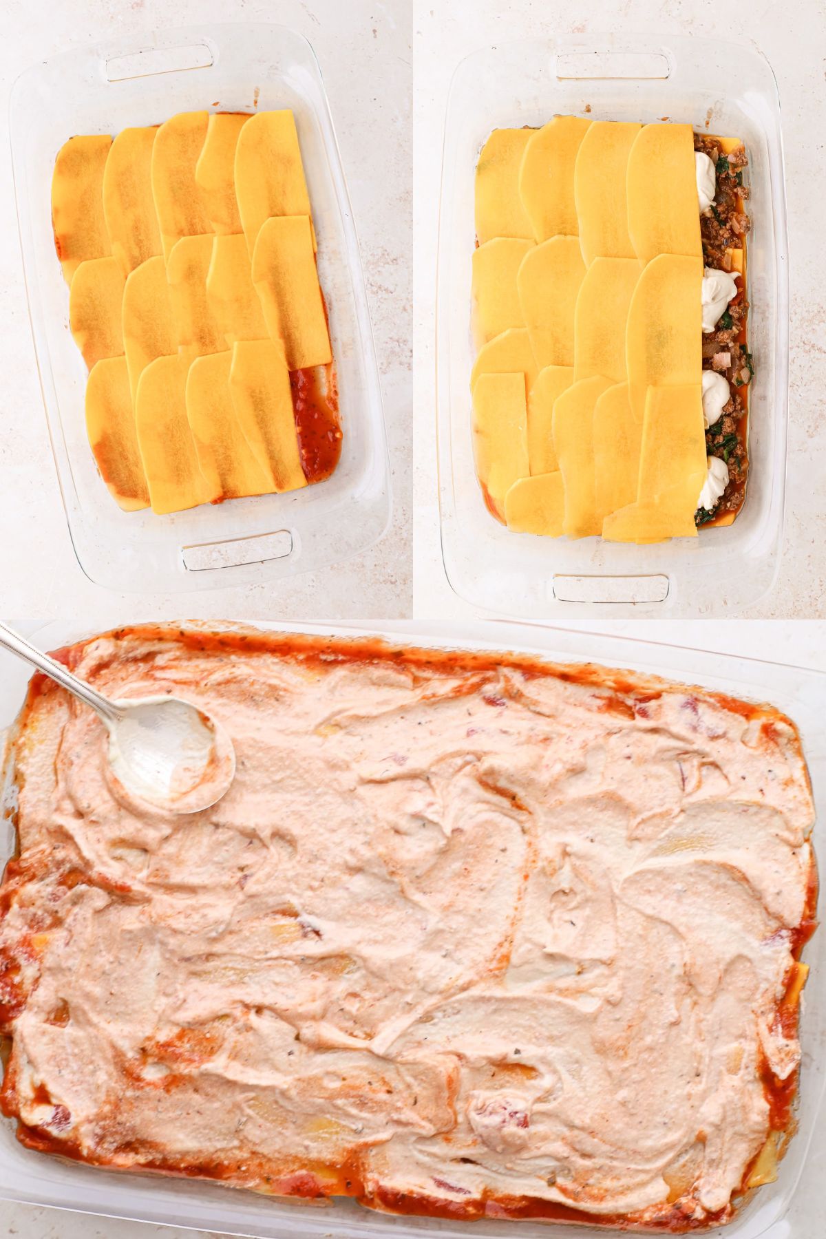 - Layering the noodles. Slightly overlap the butternut squash noodle edges. If I have some smaller pieces, I practice my Tetris skills and fit them in where I can so that it forms a ‘layer’.