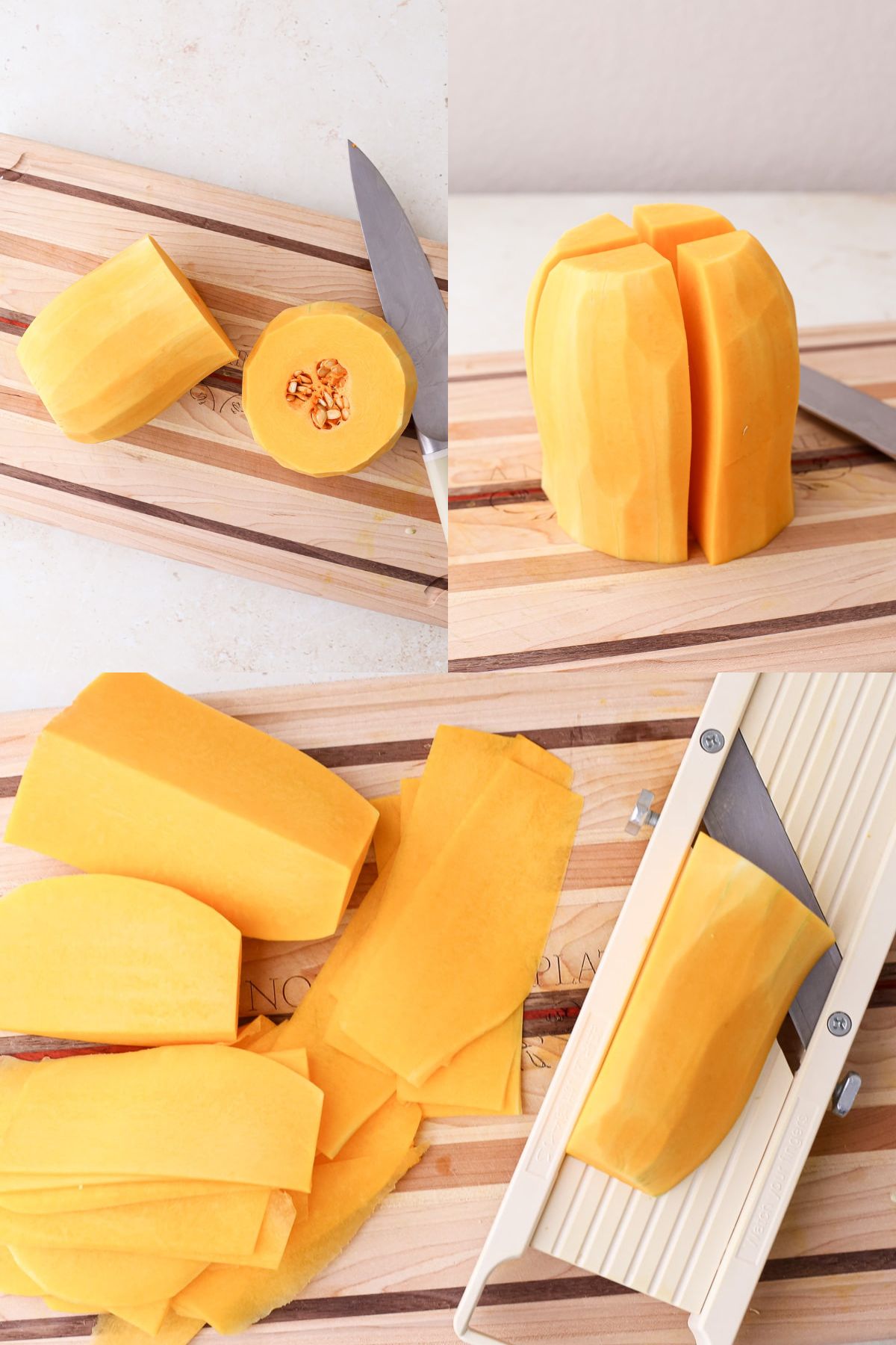 - Make squash noodles. Slice the long neck lengthwise into four quarters. Run each of the four quarters of butternut squash with the flat side down through a mandoline slicer until you have several thin butternut squash sheets. Side note: Mandolines are very sharp, so either use a safety guard or safety gloves to ensure you keep all your fingertips.