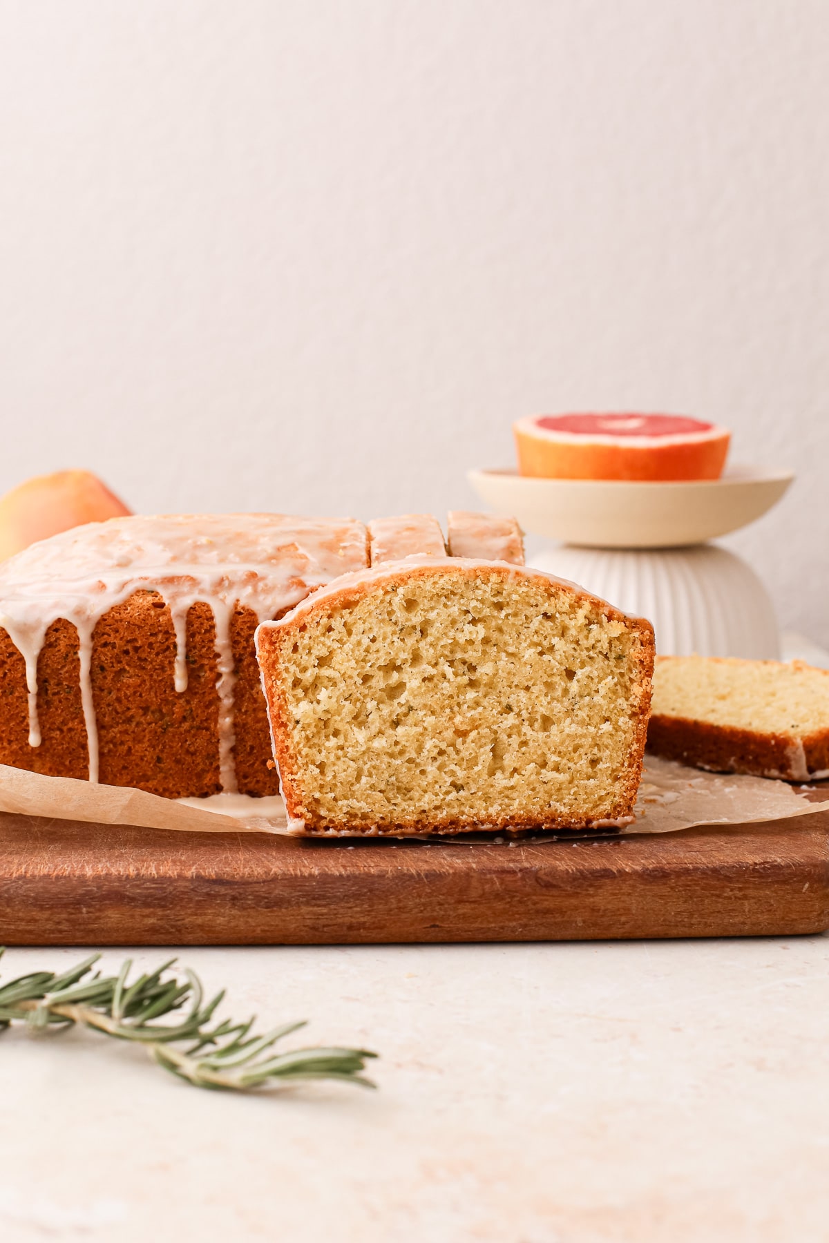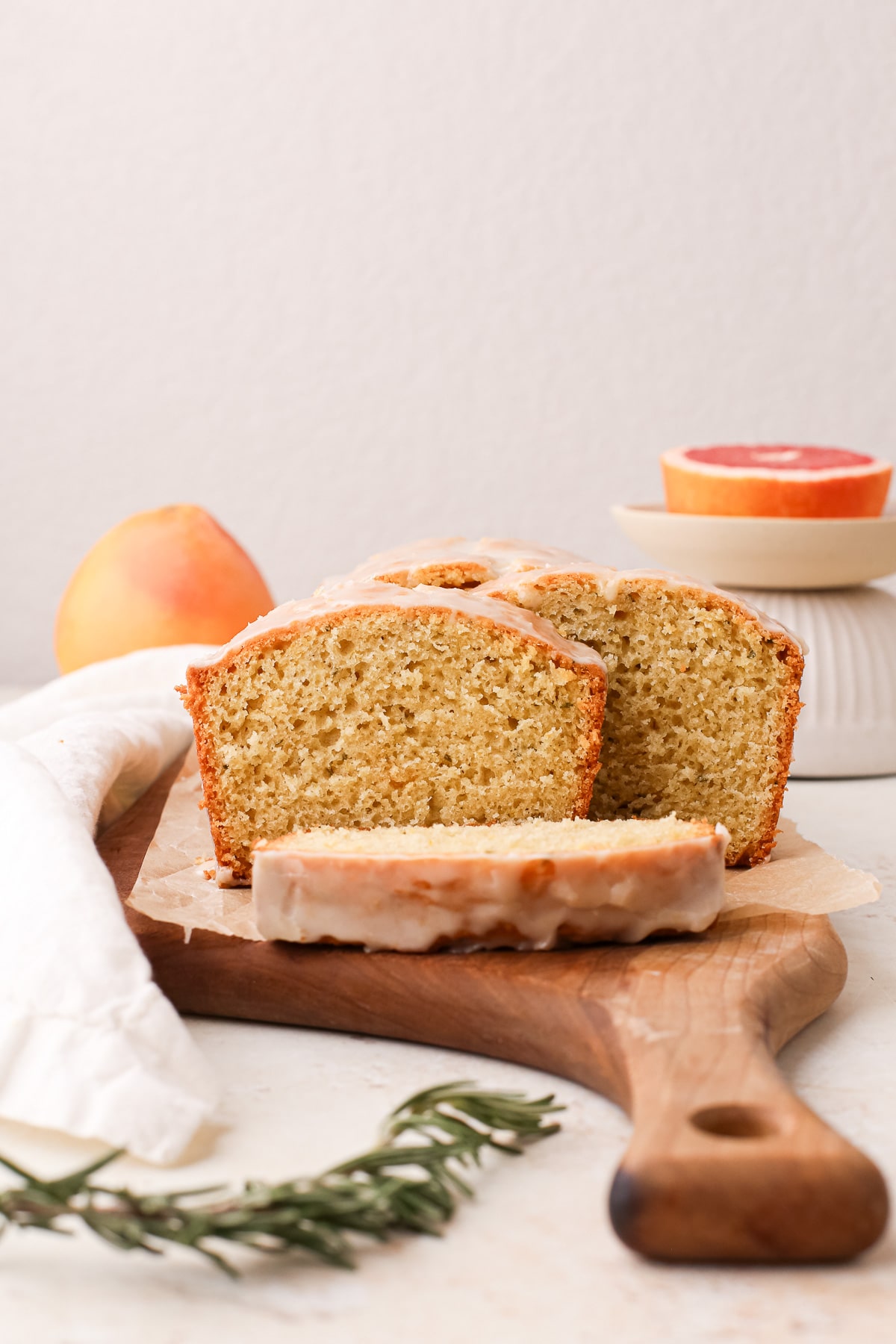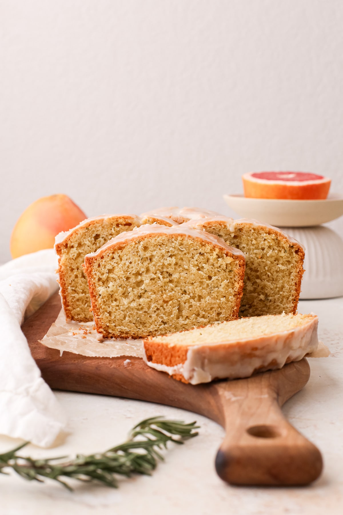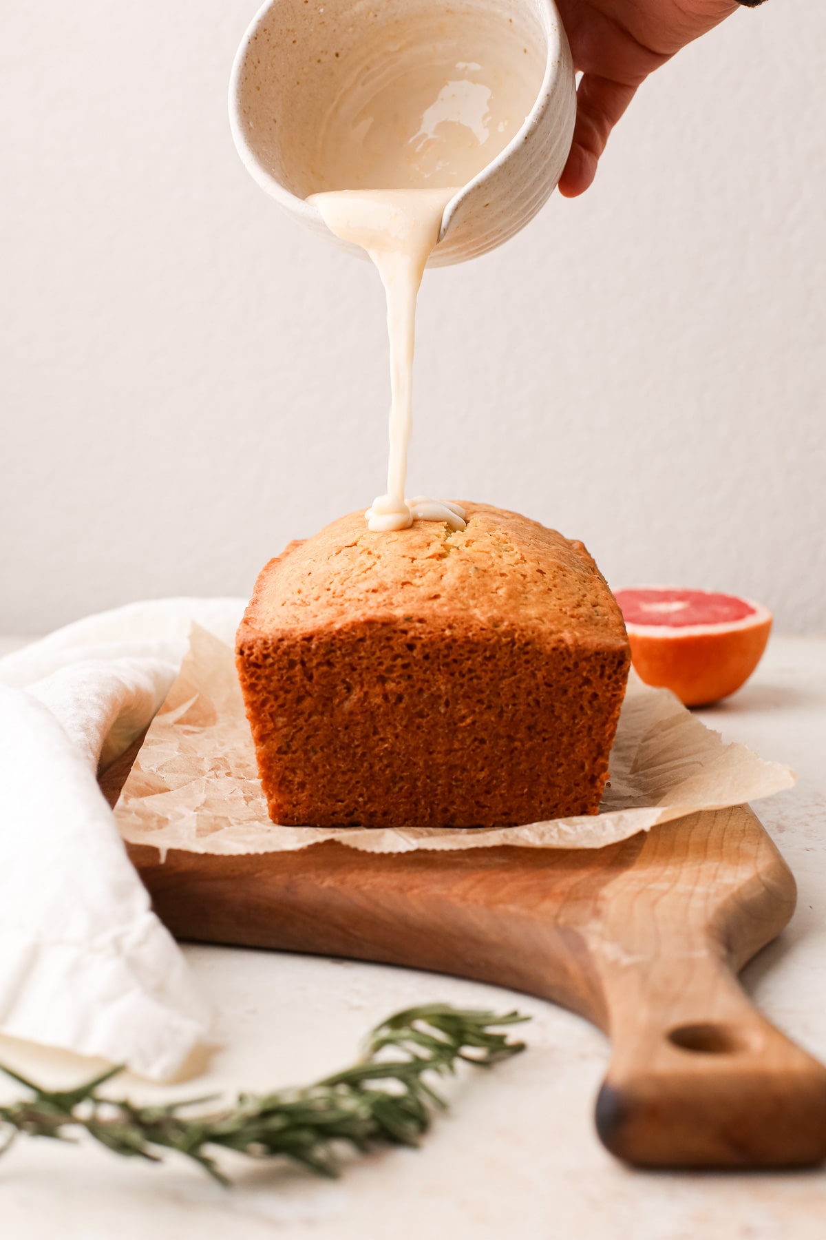 - Glaze. In a small bowl, whisk together the powdered sugar, grapefruit zest, and grapefruit juice. Thin with a little more grapefruit juice if needed. When the loaf is nearly cool, drizzle it on top of the bread, slice and enjoy!