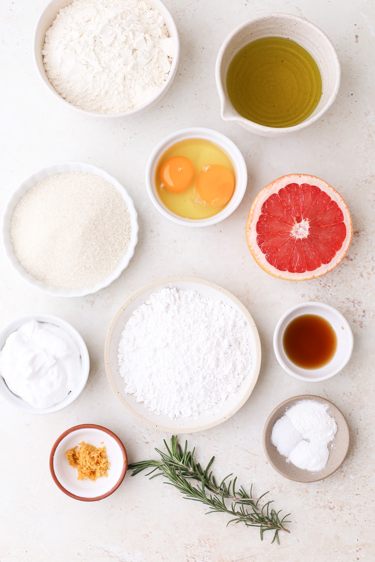 - Mix wet ingredients. Whisk the room temperature eggs into the sugar and oil mixture until smooth then mix in unsweetened yogurt, vanilla extract, grapefruit zest, and grapefruit juice. Mix in 1 tablespoon minced fresh rosemary.