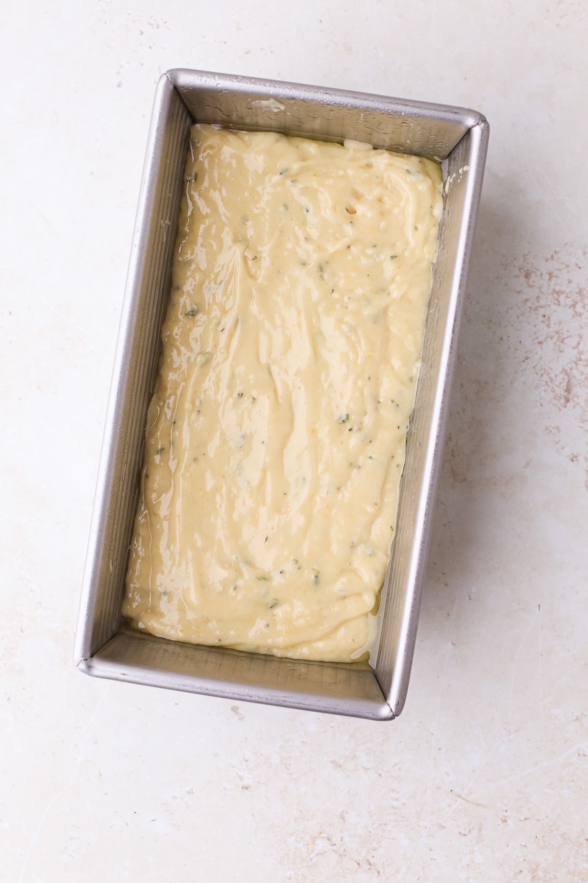 - Transfer to a loaf pan and bake. Pour batter into the prepared pan. Bake in the preheated oven for 45-48 minutes (check after 45) or when a toothpick/the tip of a knife inserted into the center comes out clean.