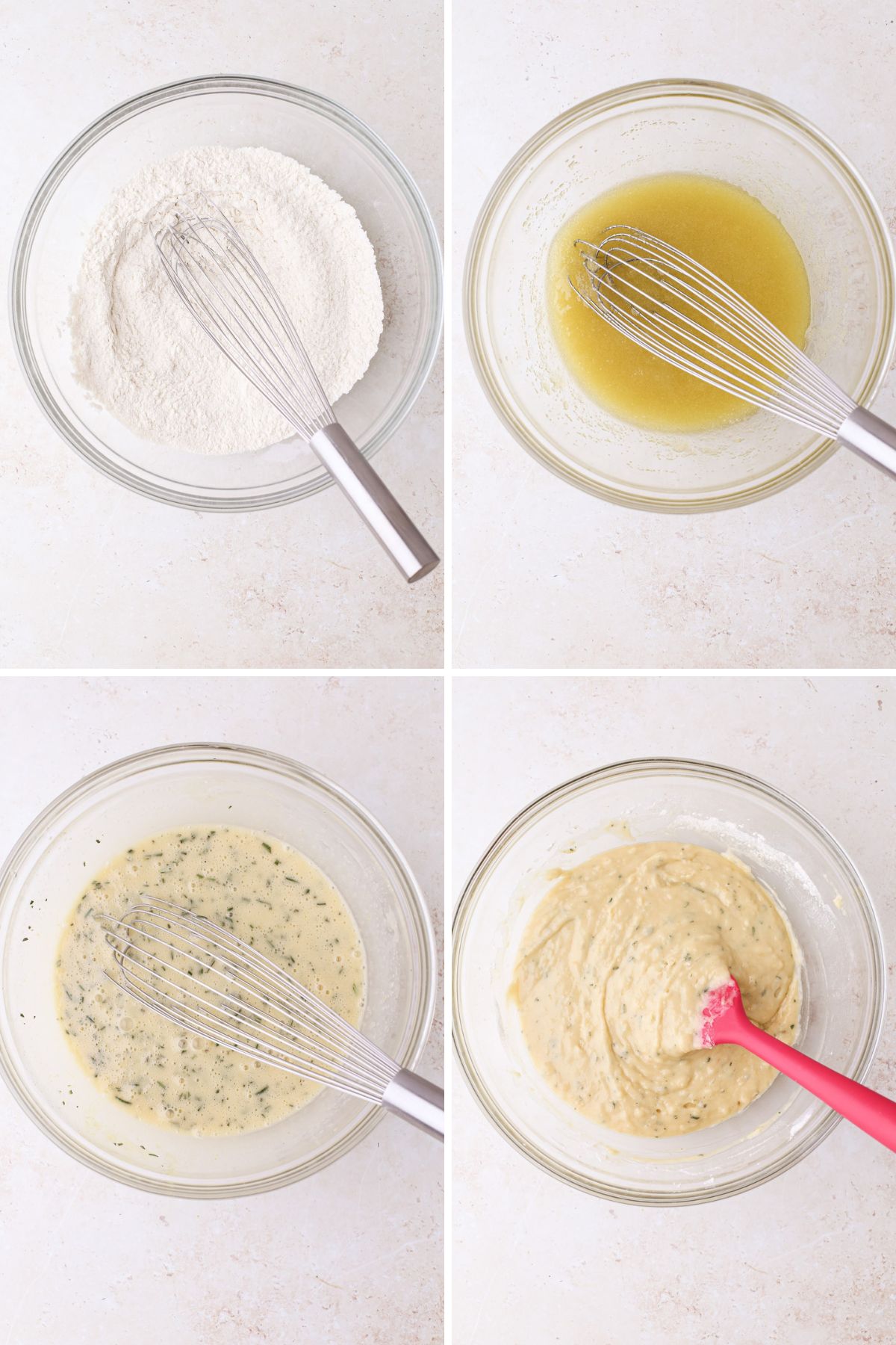 - Fold the wet into the dry. Pour the wet ingredients into the flour mixture and fold them together using a silicone spatula until just combined, don't over mix the batter.