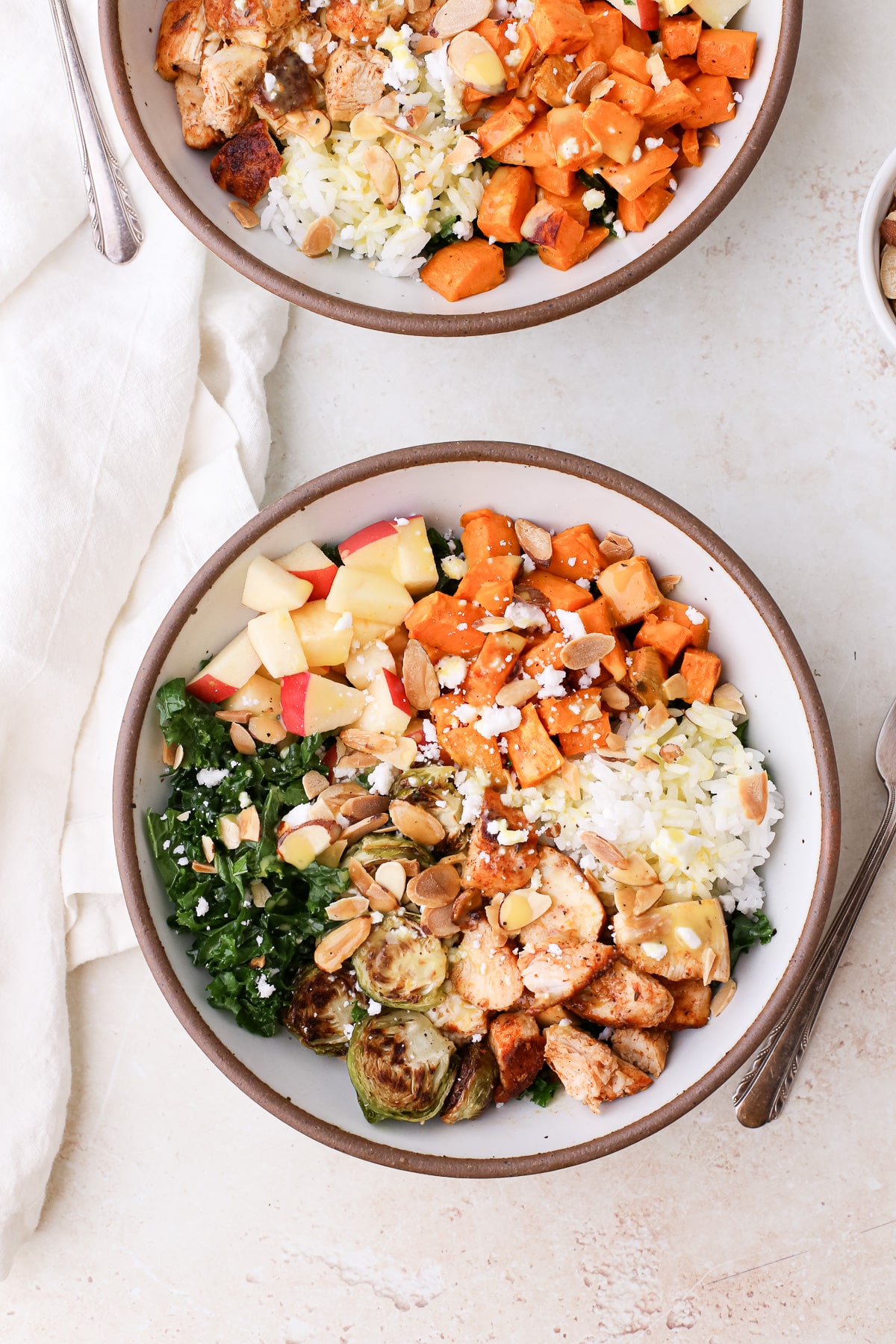 • Assemble bowls. In each bowl, add massaged kale, followed by roasted sweet potato and brussels sprouts, cooked chicken breast pieces, rice, and chopped apple. Top with toasted almonds, a sprinkle of feta cheese and a few spoonfuls of the dressing. Enjoy!