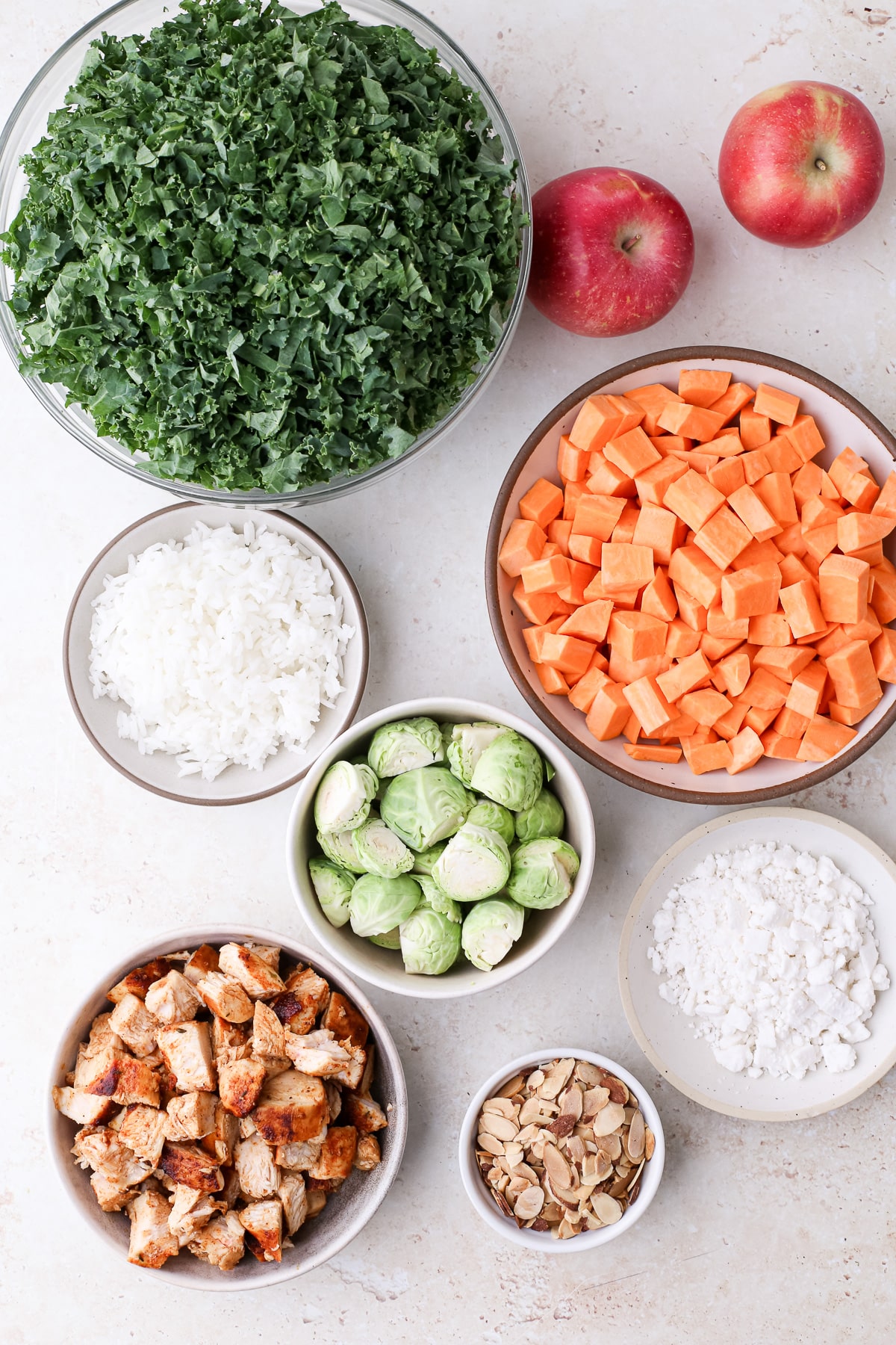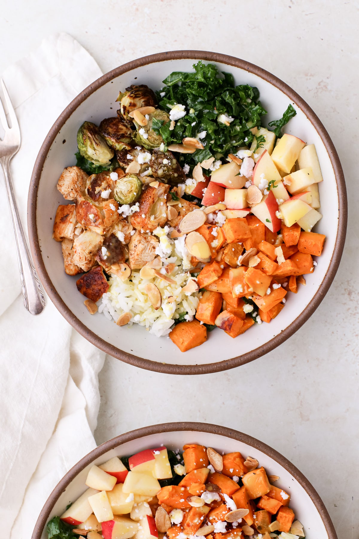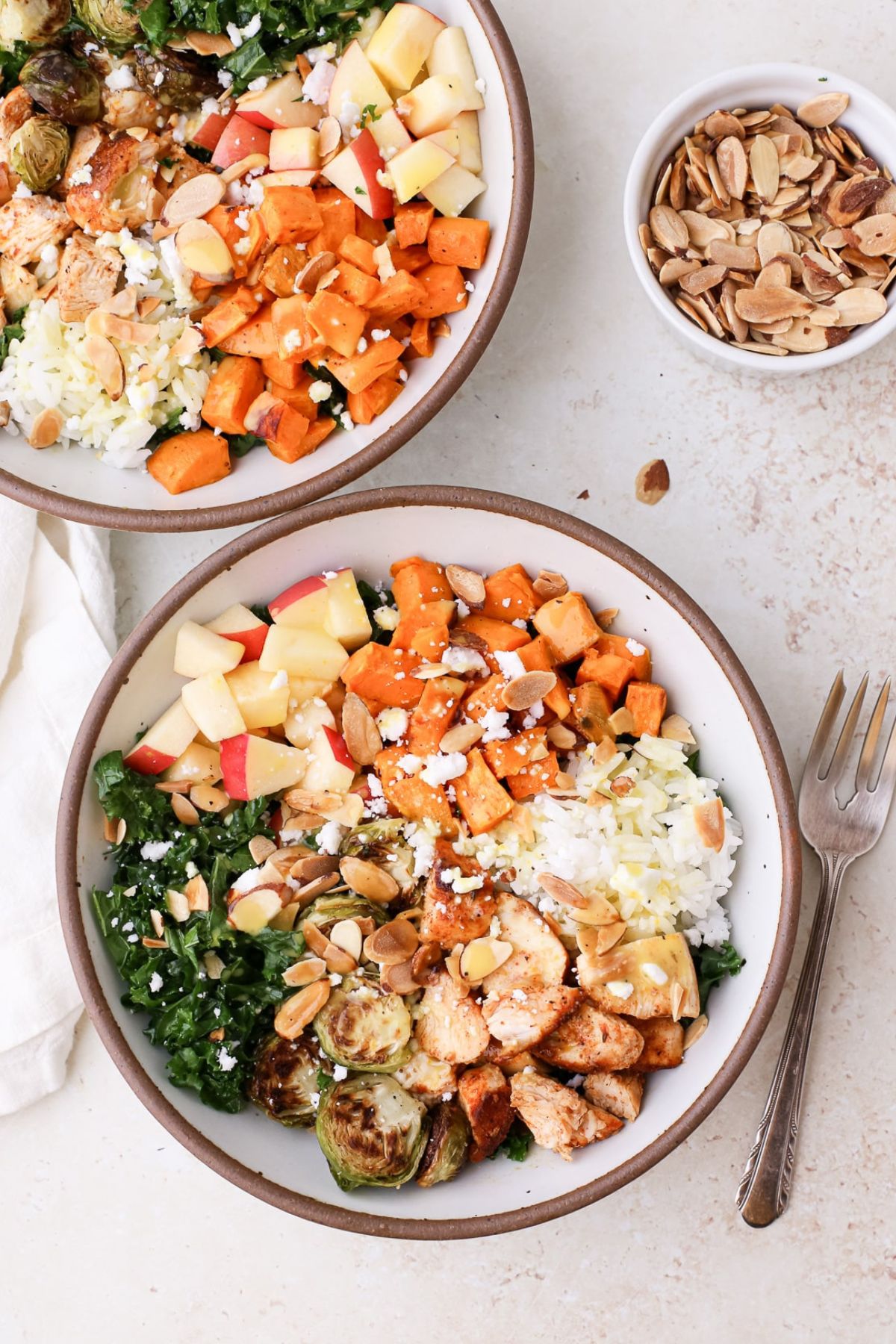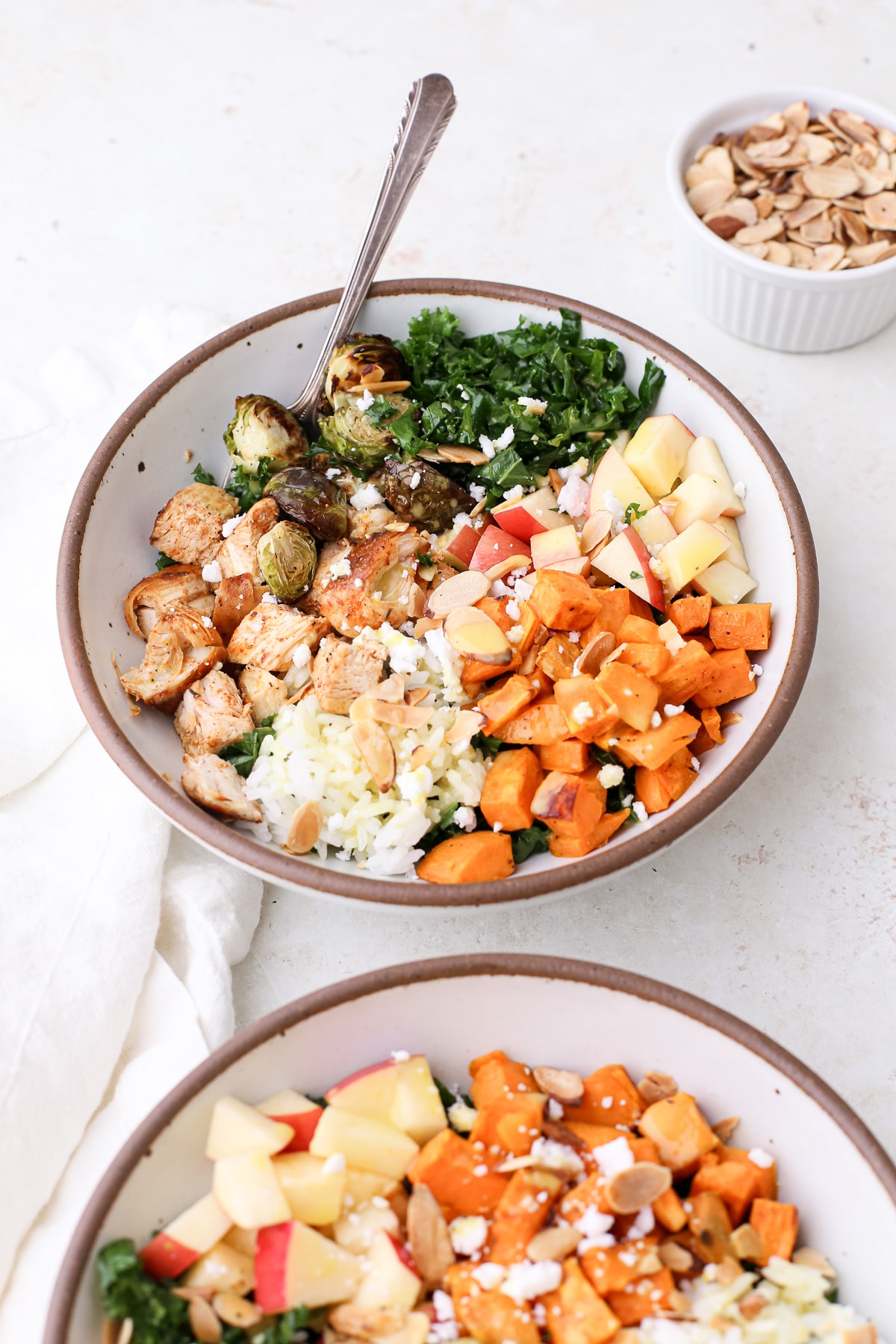 • Assemble bowls. In each bowl, add massaged kale, followed by roasted sweet potato and brussels sprouts, cooked chicken breast pieces, rice, and chopped apple. Top with toasted almonds, a sprinkle of feta cheese and a few spoonfuls of the dressing. Enjoy!
