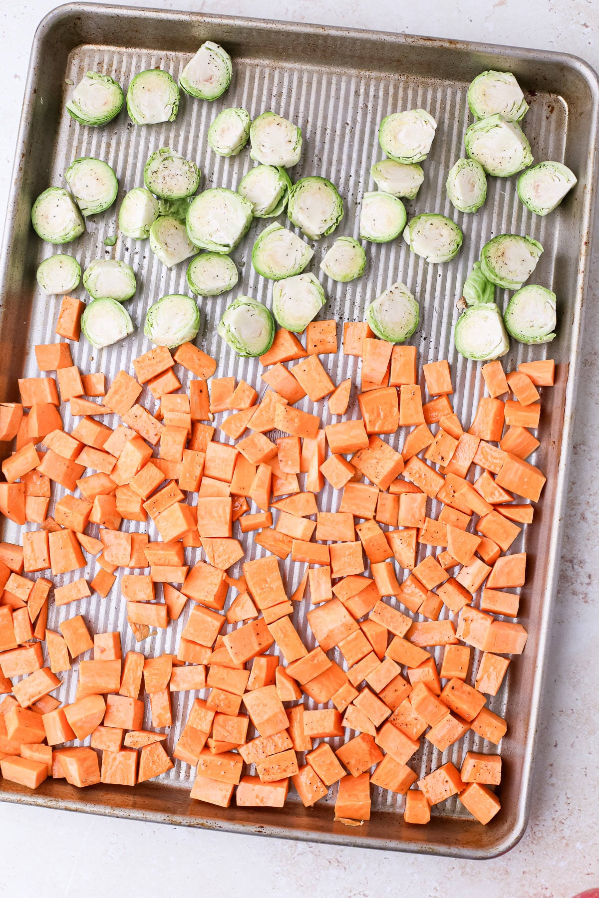 • Roast veggies. Add halved brussels sprouts to one half of a bare baking sheet and the cubed sweet potatoes to the other half. Roast for 30-35 minutes, stirring both halfway through.