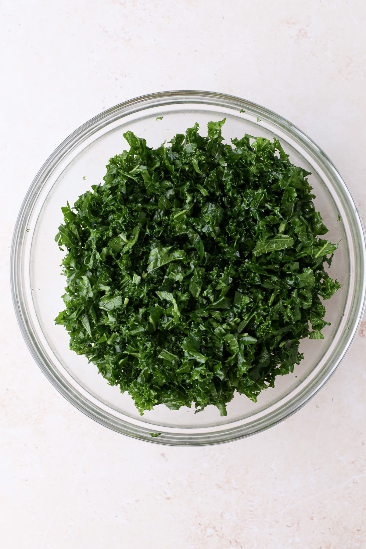 2. Massage kale. In a large bowl, use your hands to massage the shredded kale with a tiny bit of olive oil for 1 minute. This helps soften and tenderize the leafy greens.