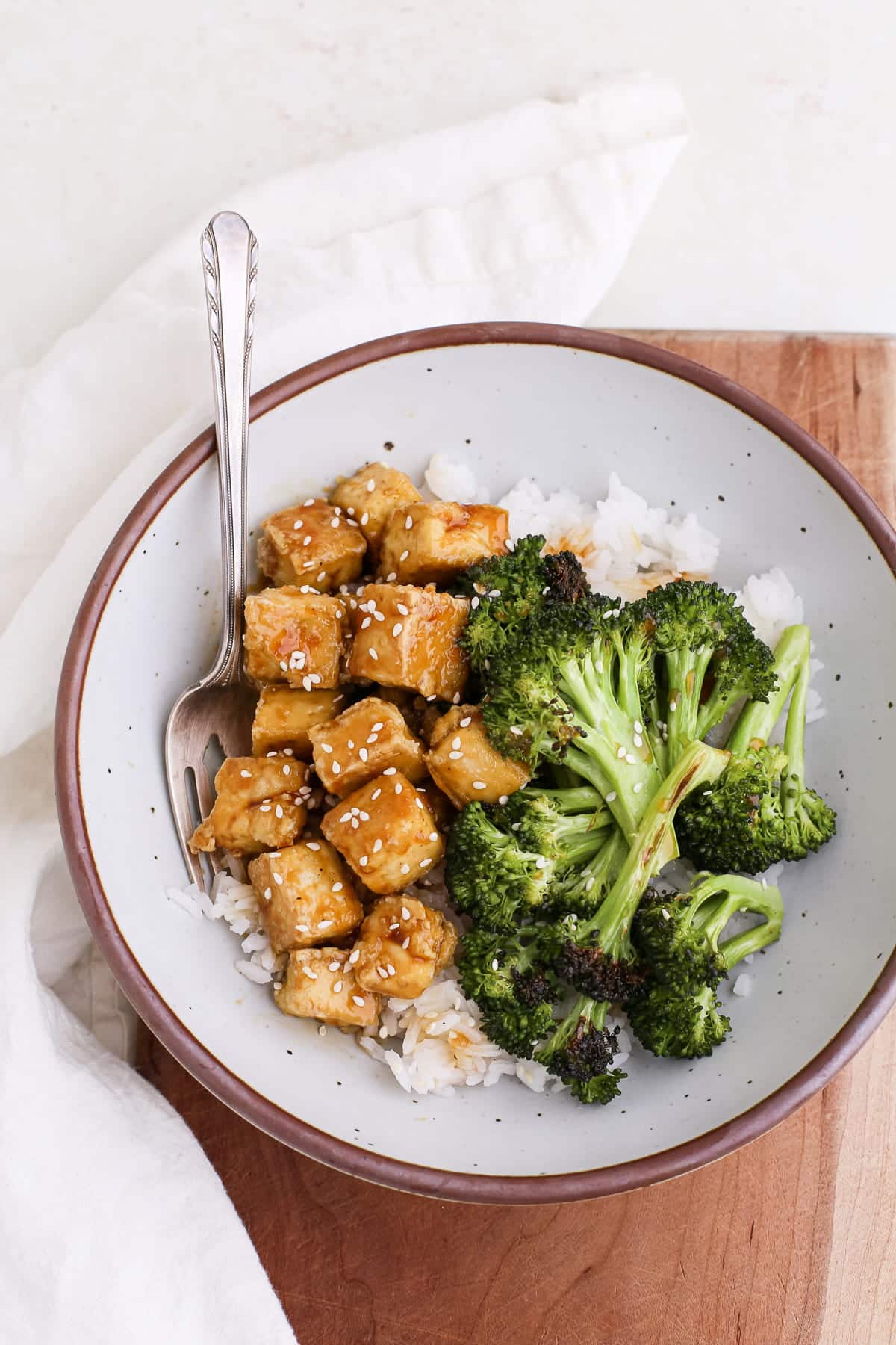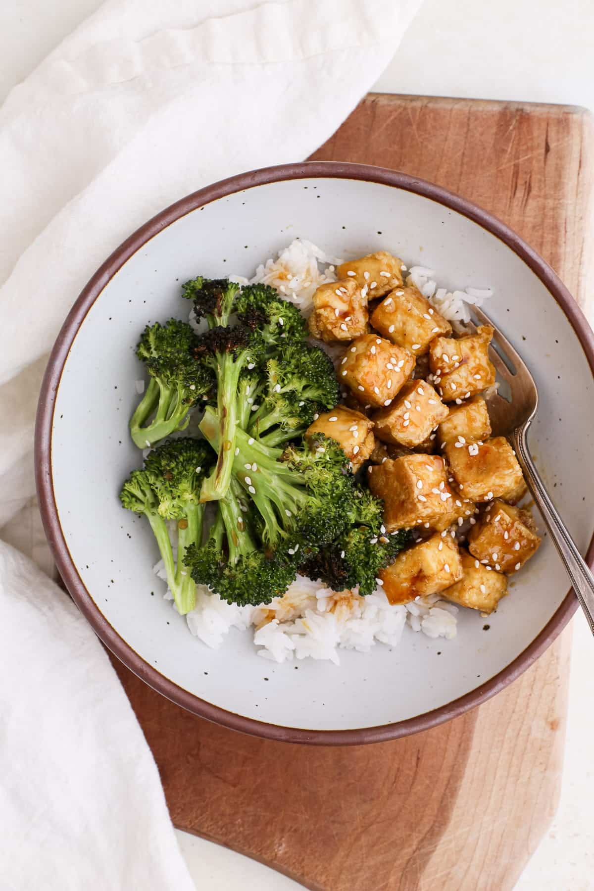 - Combine. Toss the crispy tofu in the sauce until well coated then serve with white rice and roasted broccoli. Garnish with sesame seeds if desired. Enjoy!