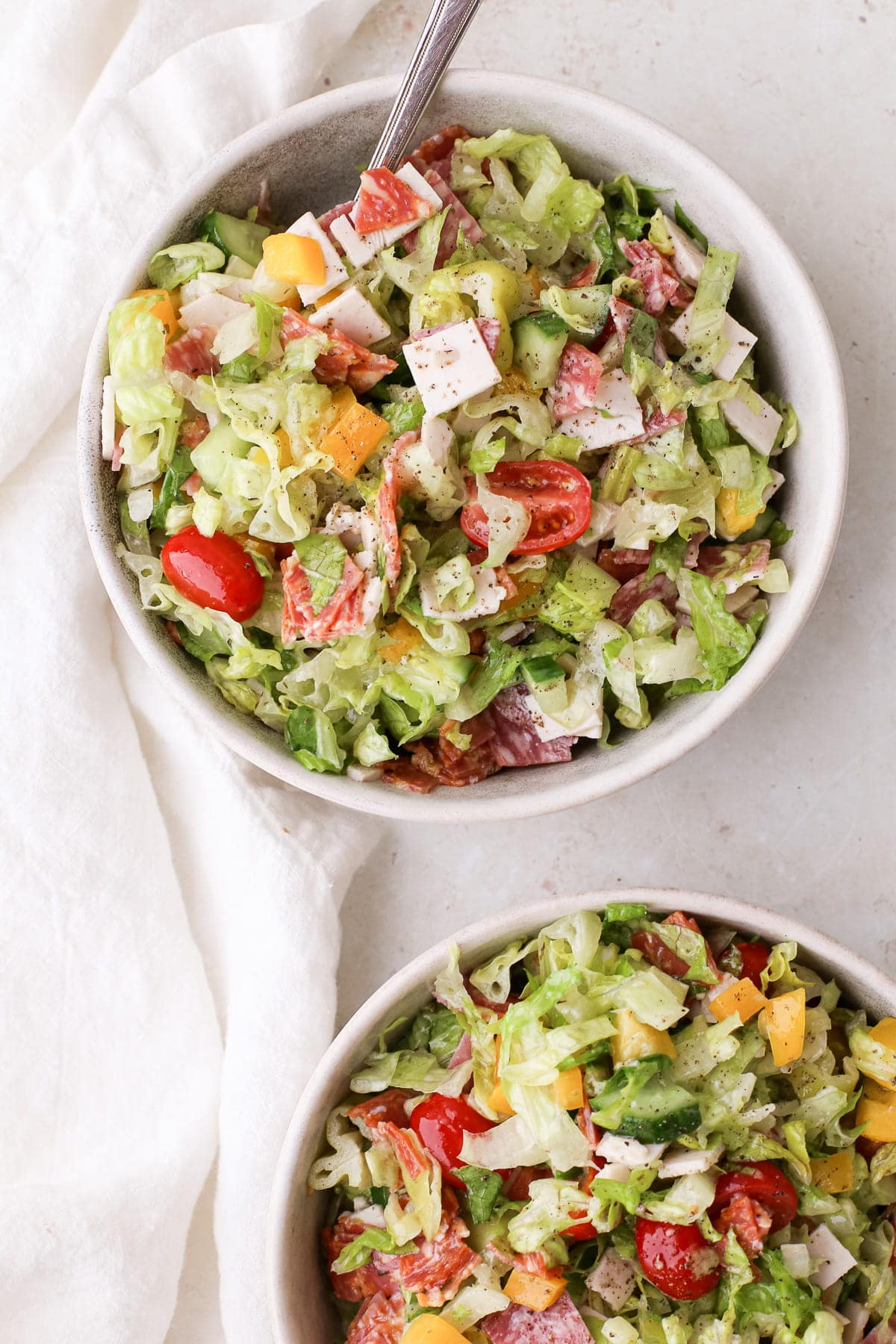Italian grinder salad is the classic Italian sub sandwich in salad form. It’s topped with a lightly creamy, tangy homemade dressing and is loaded with vegetables and protein. This salad recipe is dairy free and gluten free.
