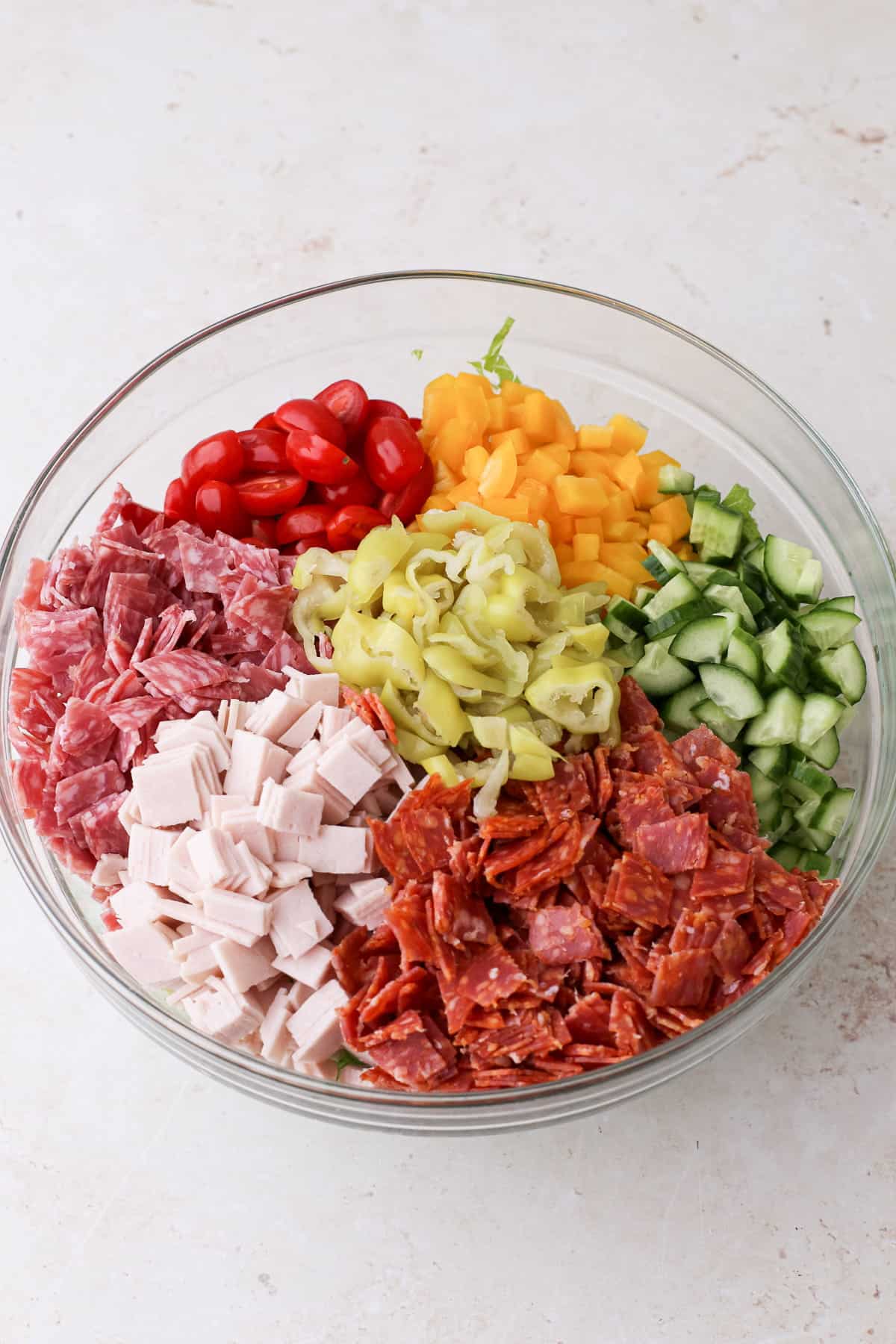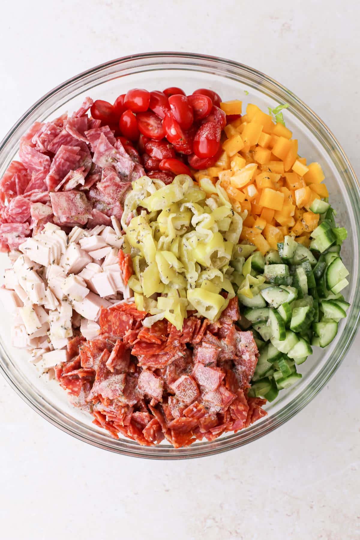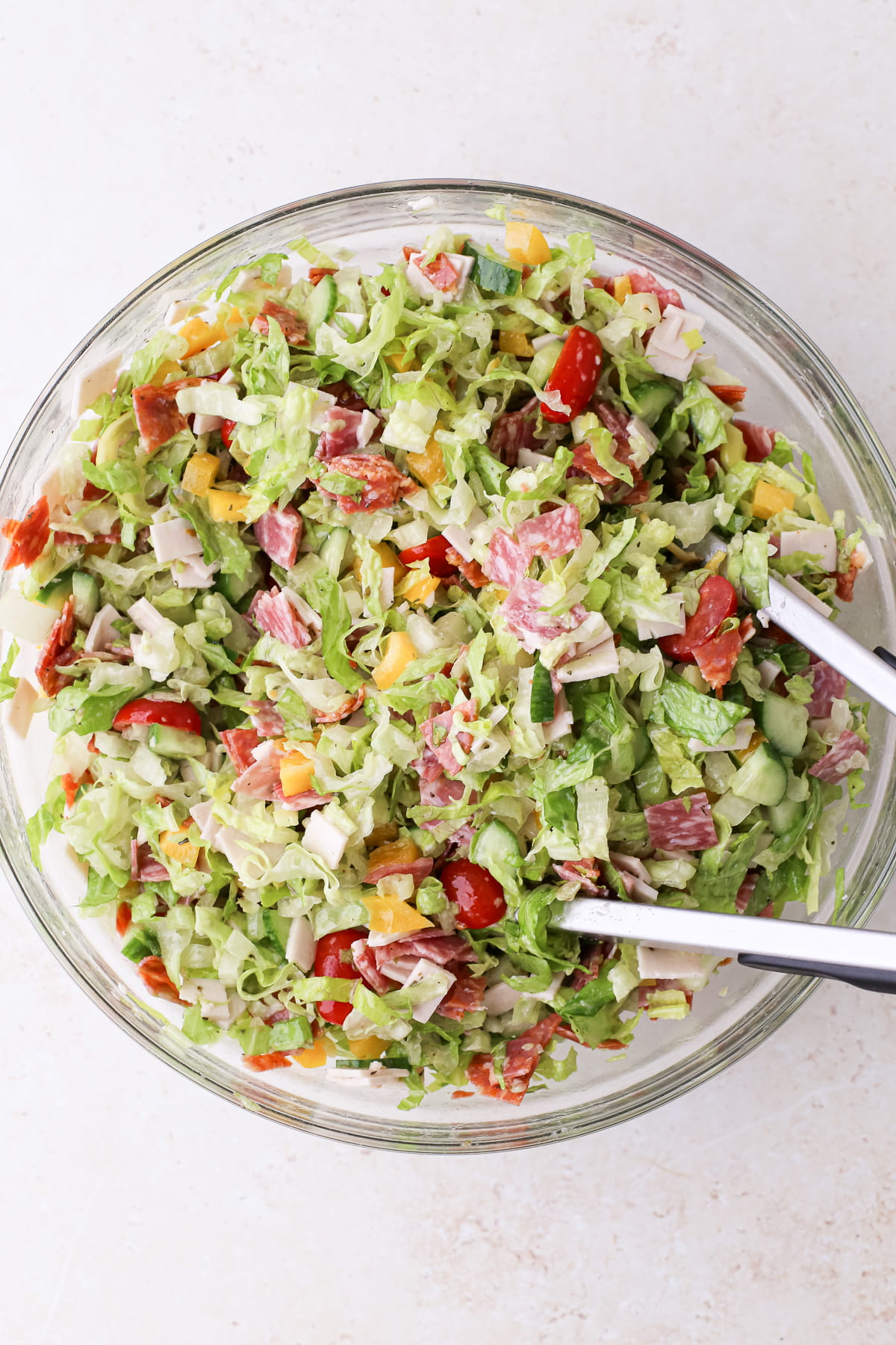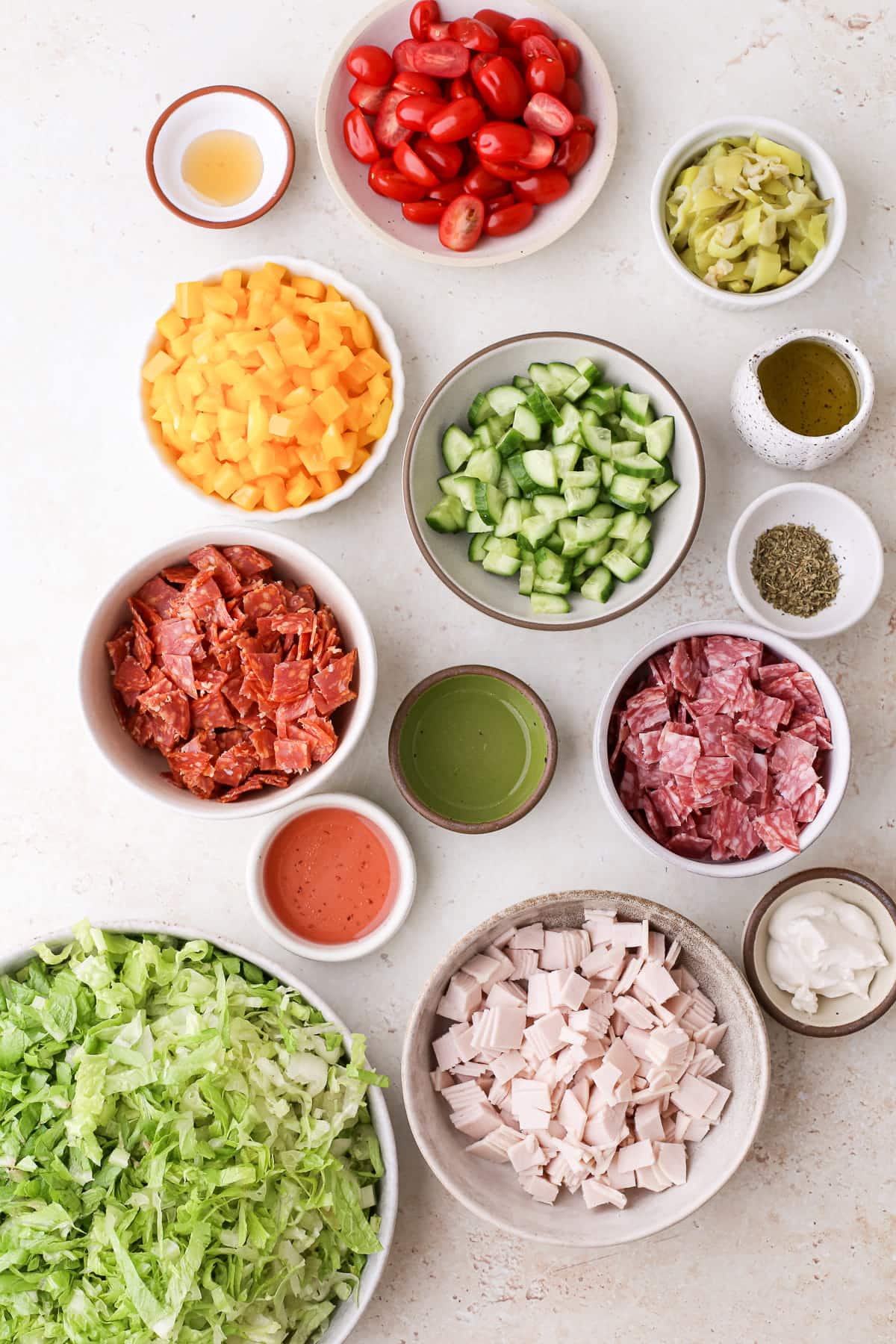 - Tangy dressing – olive oil, red wine vinegar, pepperoncini juice, mayonnaise, Italian seasoning, honey, kosher salt, and freshly ground black pepper. This isn’t as creamy as what’s typically on an Italian grinder sandwich. It’s more of a creamy Italian vinaigrette dressing, which I prefer for a salad like this, otherwise, it kind of drowns in the dressing.