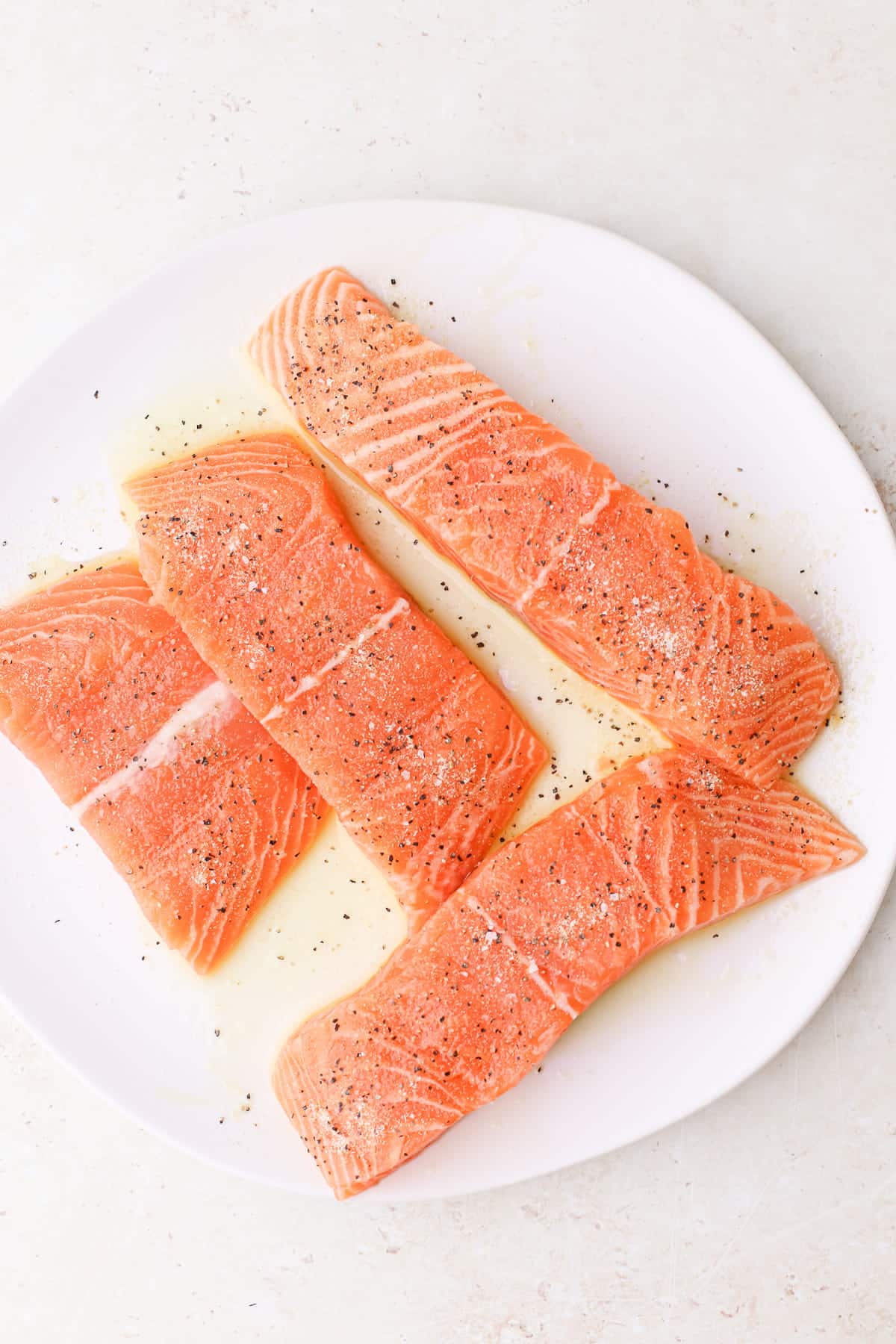 - Season salmon. Pat the salmon dry with paper towels then transfer them to a plate. Rub each fillet with 1 tablespoon olive oil kosher salt, garlic powder, onion powder, and black pepper.