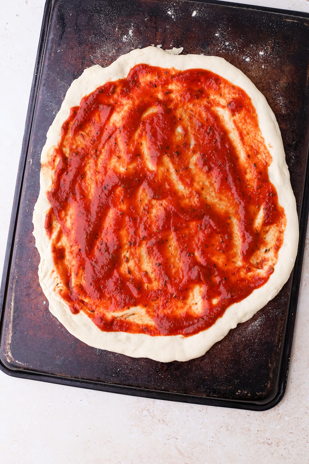 • No special equipment needed – You don’t need a pizza pan, pizza oven, or pizza stone to make incredible homemade pizza. A preheated inverted sheet pan also does the trick!
