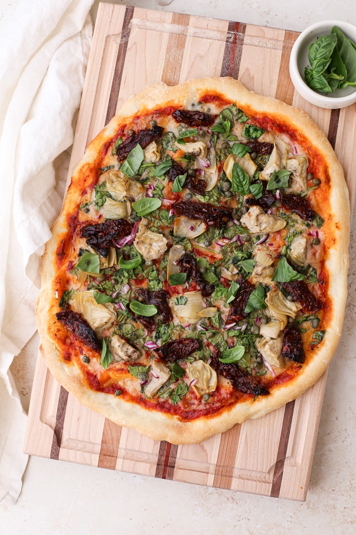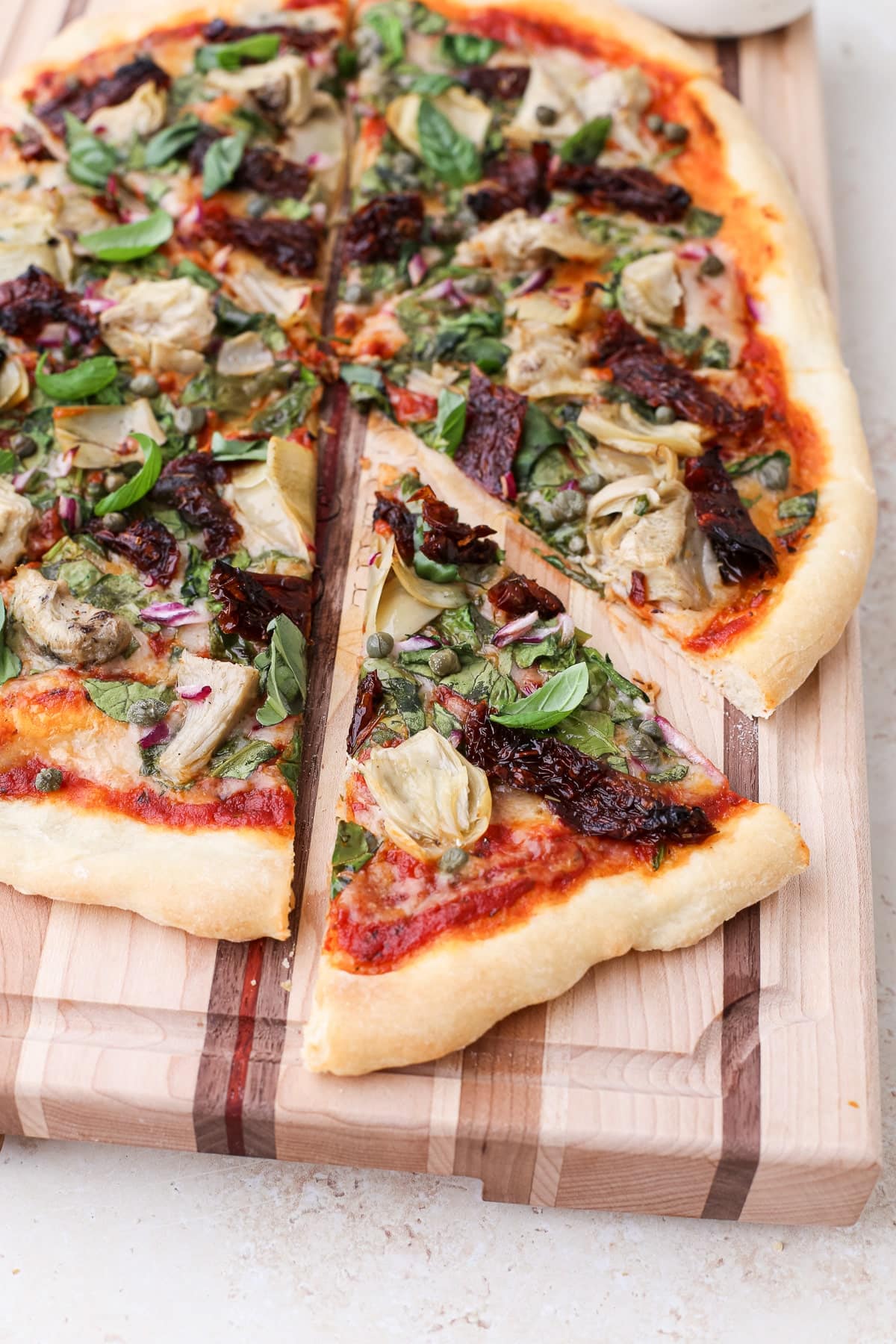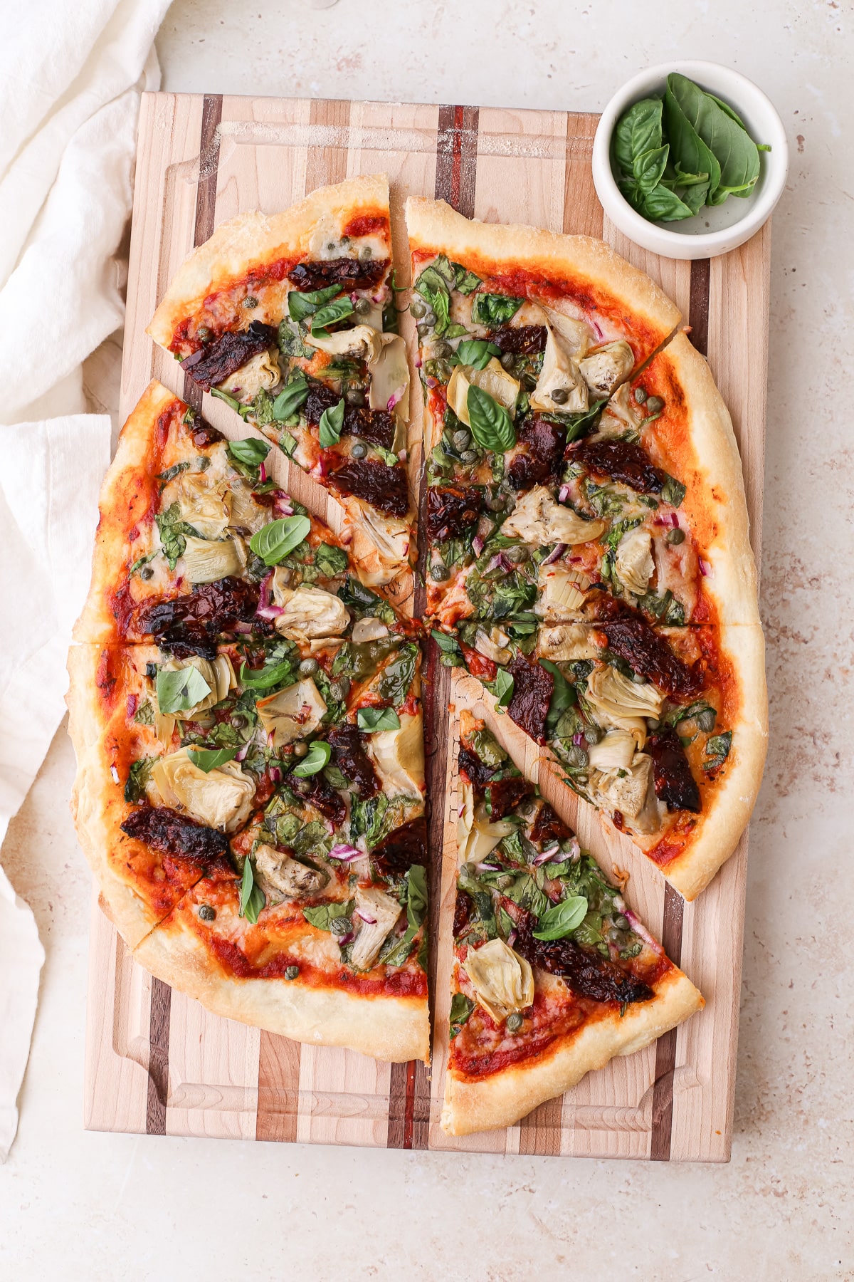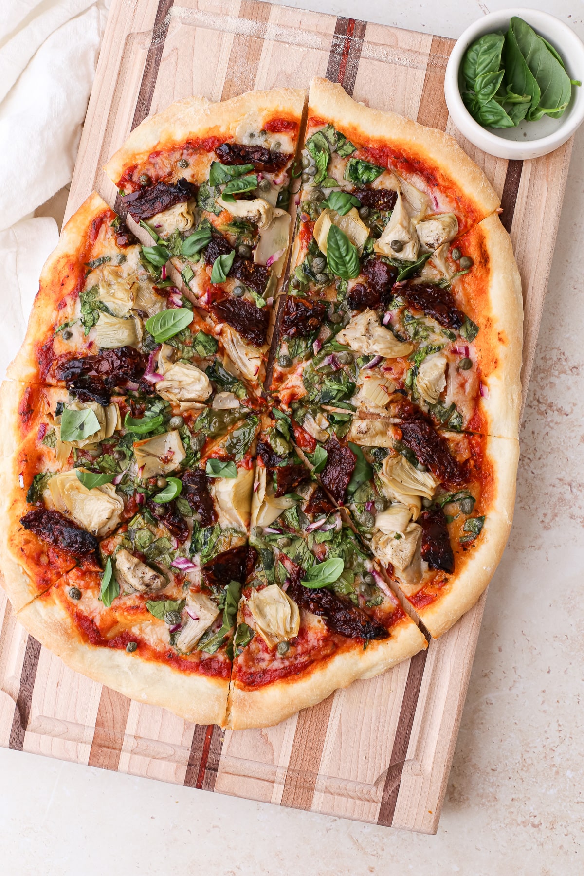 A large homemade mediterranean pizza topped with fresh basil on a striped wooden cutting board cut into 8 pizza slices.