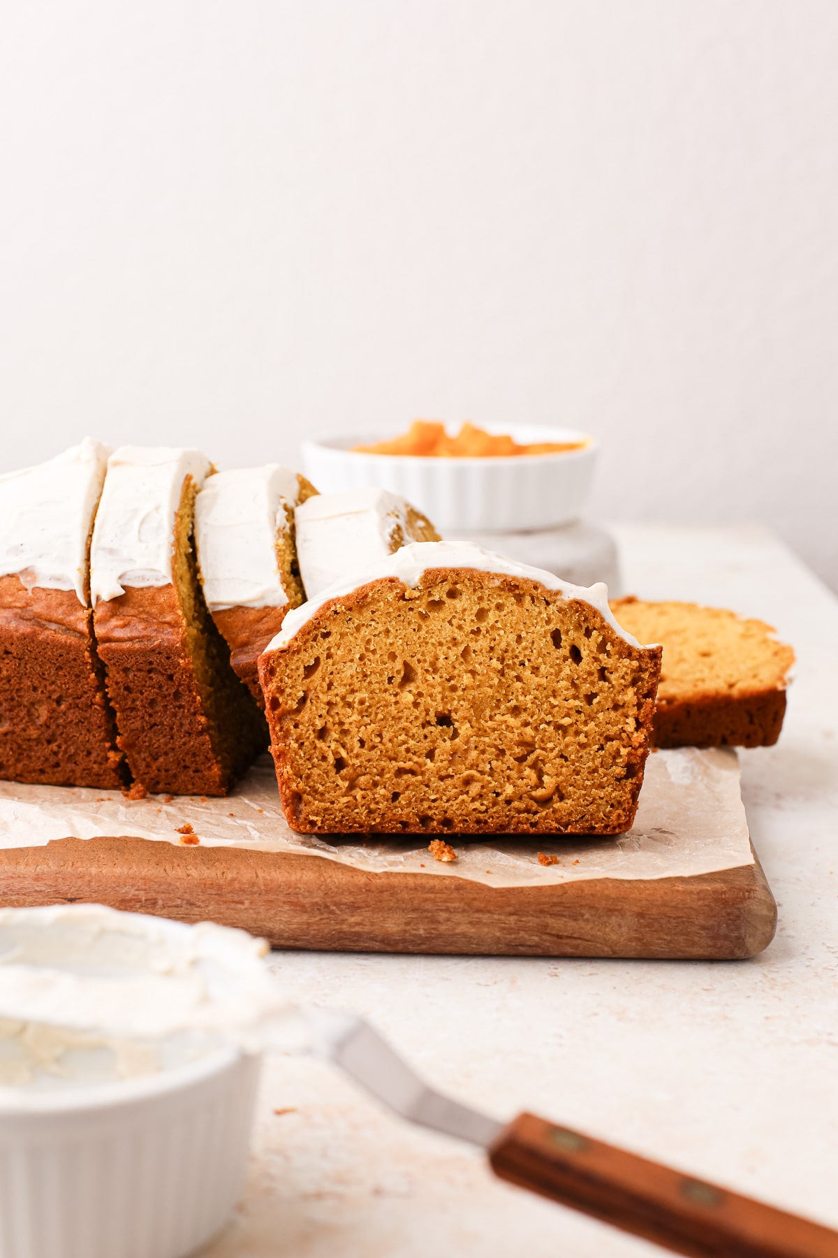 Slices of pumpkin olive oil cake with vanilla cinnamon yogurt topping on a cutting board.