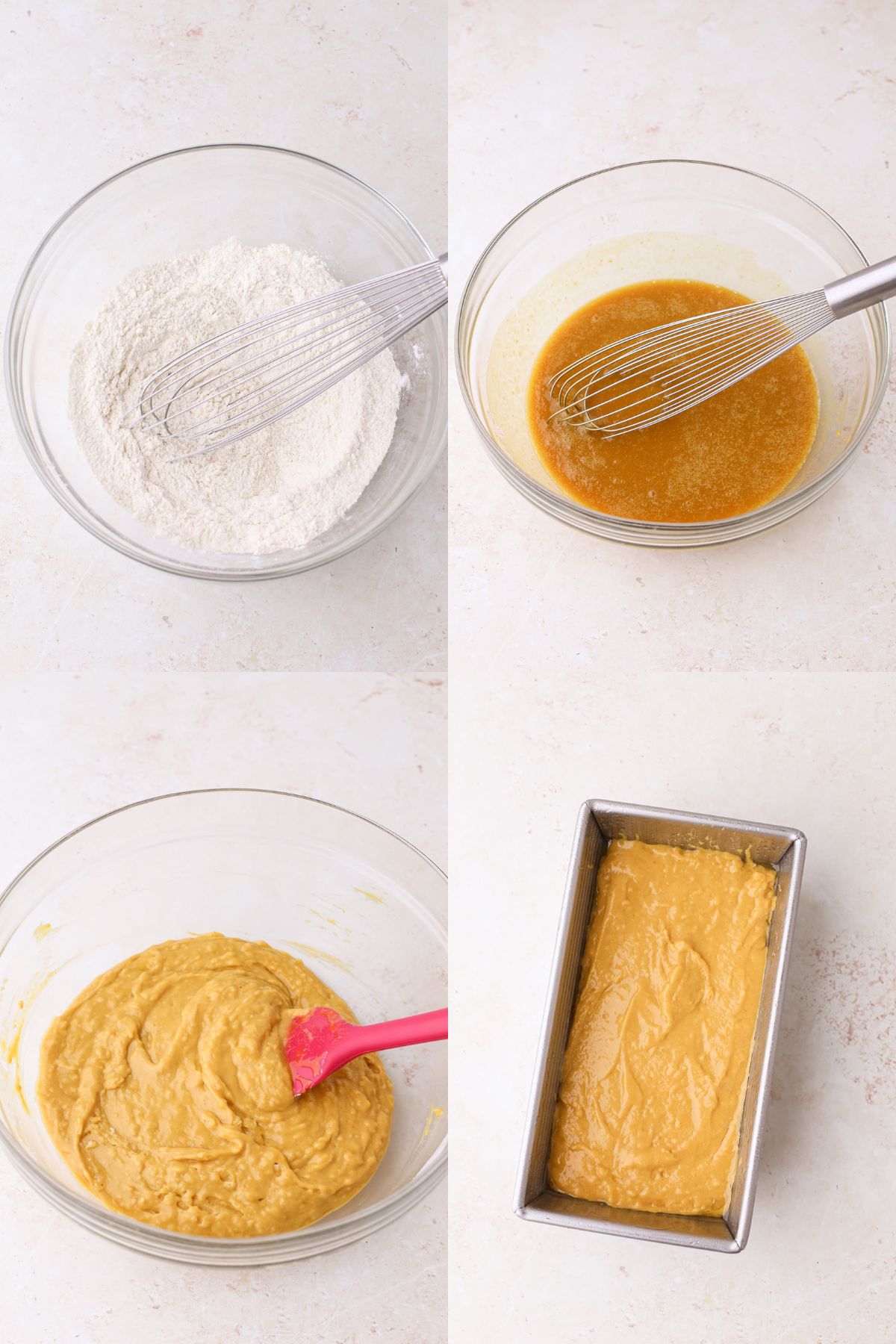 5. Bake. Pour the pumpkin batter into your prepared pan and bake for 55-60 minutes in the center of your oven. It’s ready when a toothpick or the tip of a knife inserted into the center of the loaf comes out clean and the top of the loaf is golden brown.