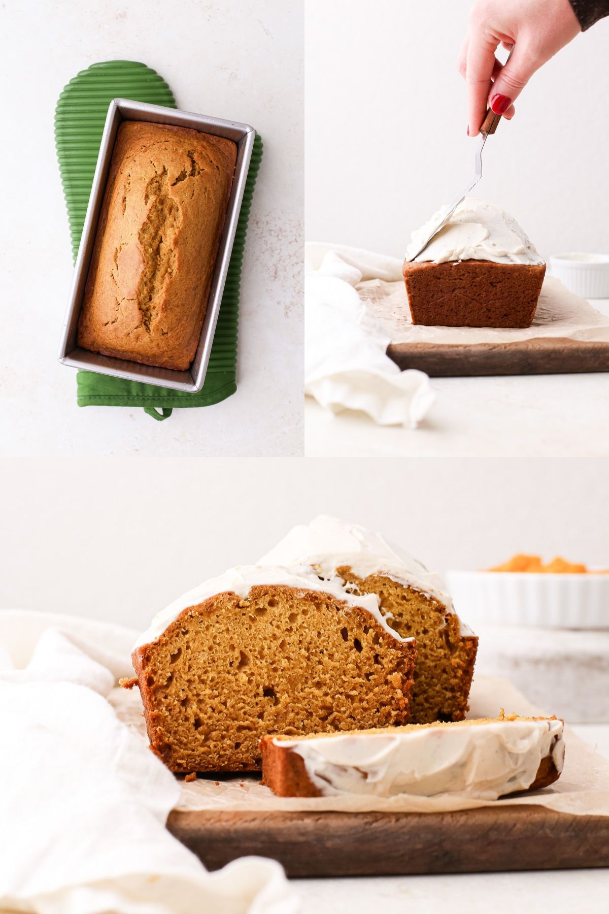 • Bake. Pour the pumpkin batter into your prepared pan and bake for 55-60 minutes in the center of your oven. It's ready when a toothpick or the tip of a knife inserted into the center of the loaf comes out clean and the top of the loaf is golden brown.