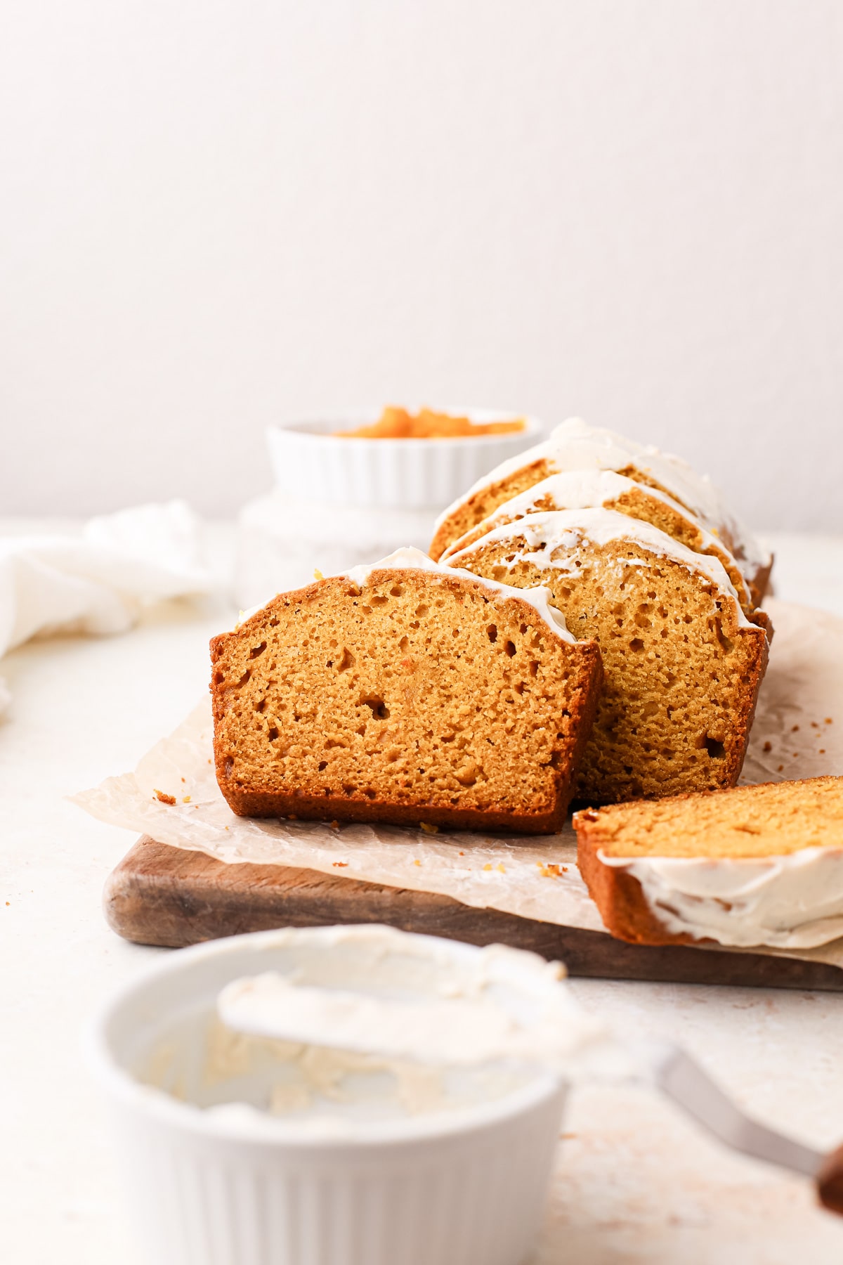 Slices of pumpkin olive oil cake with vanilla cinnamon yogurt topping on a cutting board.