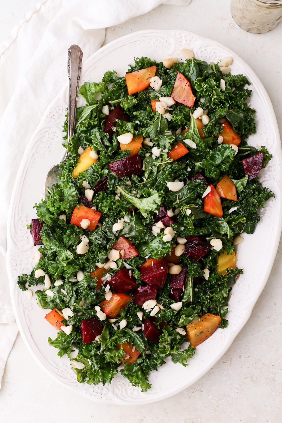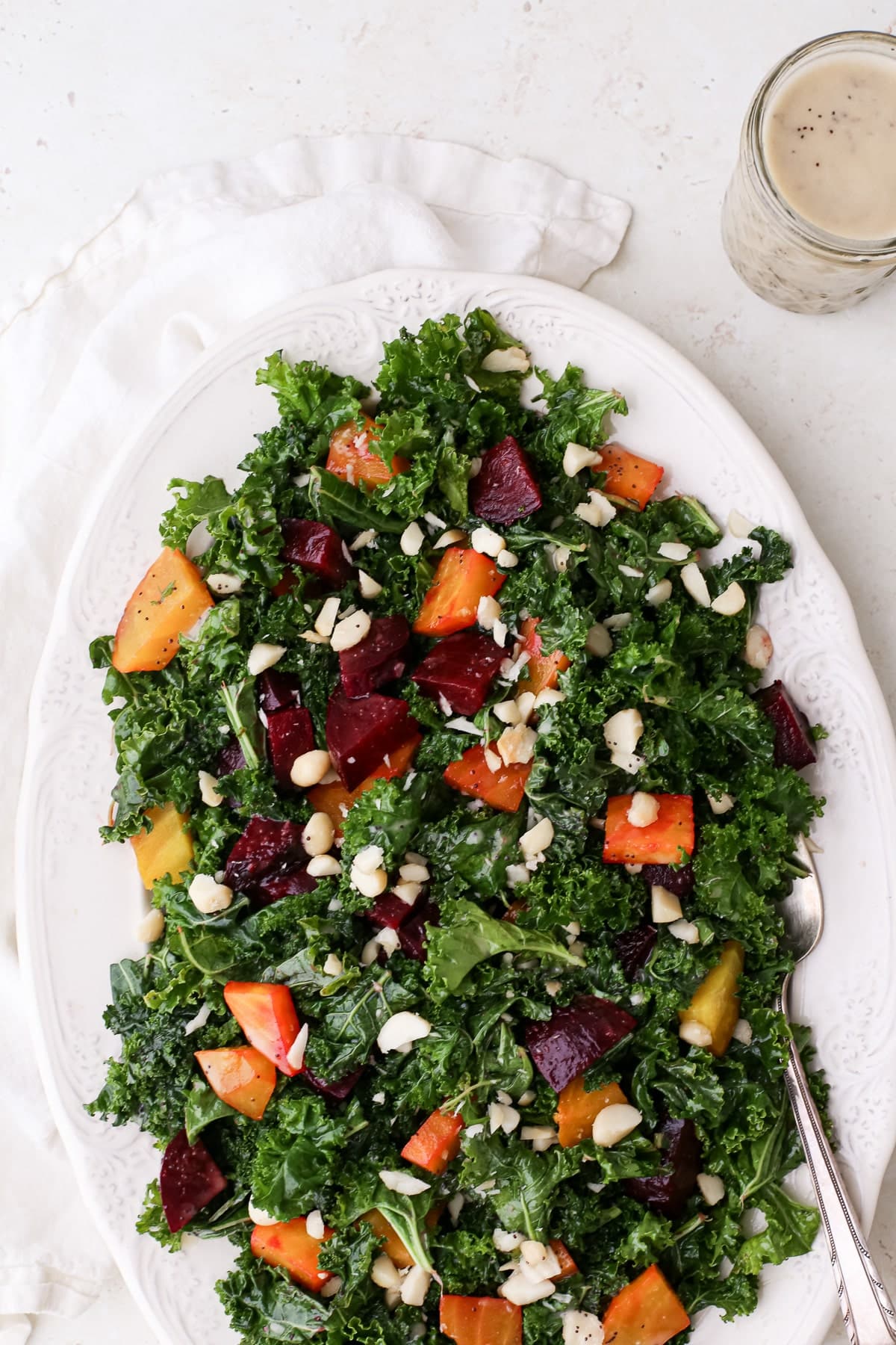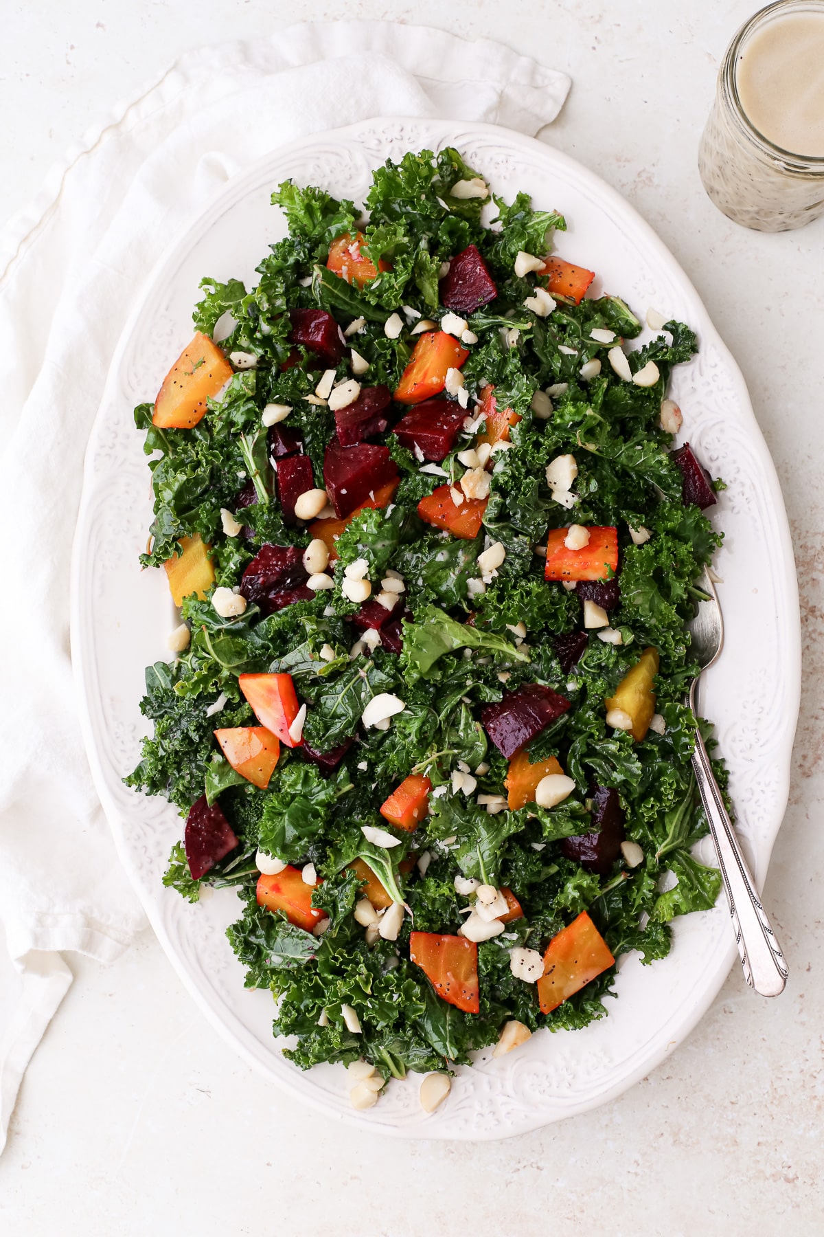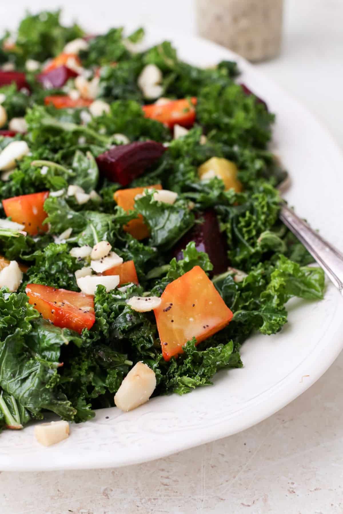 Beet kale salad is a hearty salad with a mix of red and golden beets, fresh kale, chopped nuts, and a homemade poppy seed vinaigrette. This colorful side dish is gluten free and dairy free.