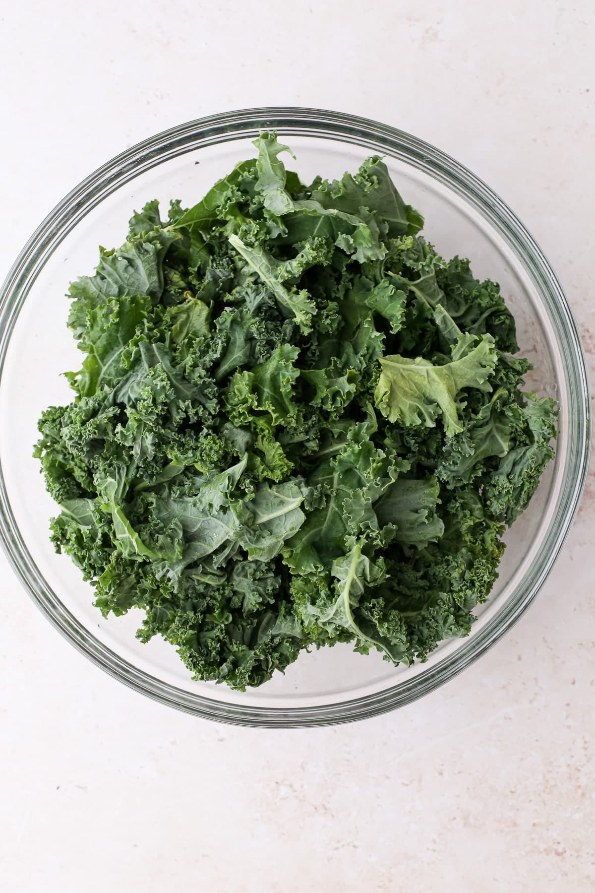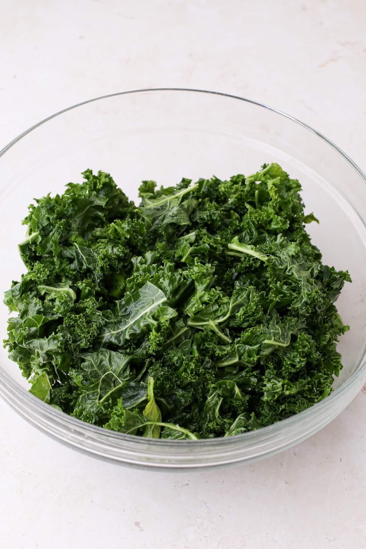 - Massage kale.ย Add washed and spun kale leaves to a large bowl along with 2 teaspoons of olive oil. Use your hands to massage the kale for 1 minute to soften and tenderize the leaves. Set aside.