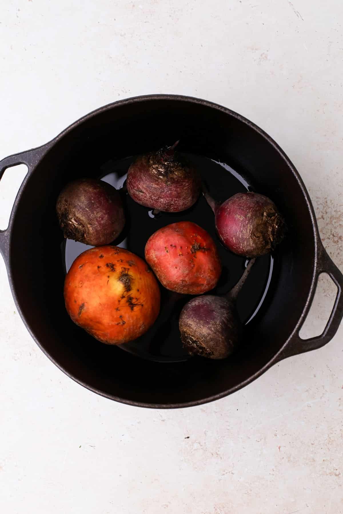 - Roast beets. Add a generous glug of olive oil to the bottom of a dutch oven pot or line it with parchment paper. Arrange the beets in a single layer then cover with a lid and bake for 1 hour, turning the beets over halfway through. Check smaller beets for doneness after 45 minutes with the tip of a sharp knife.