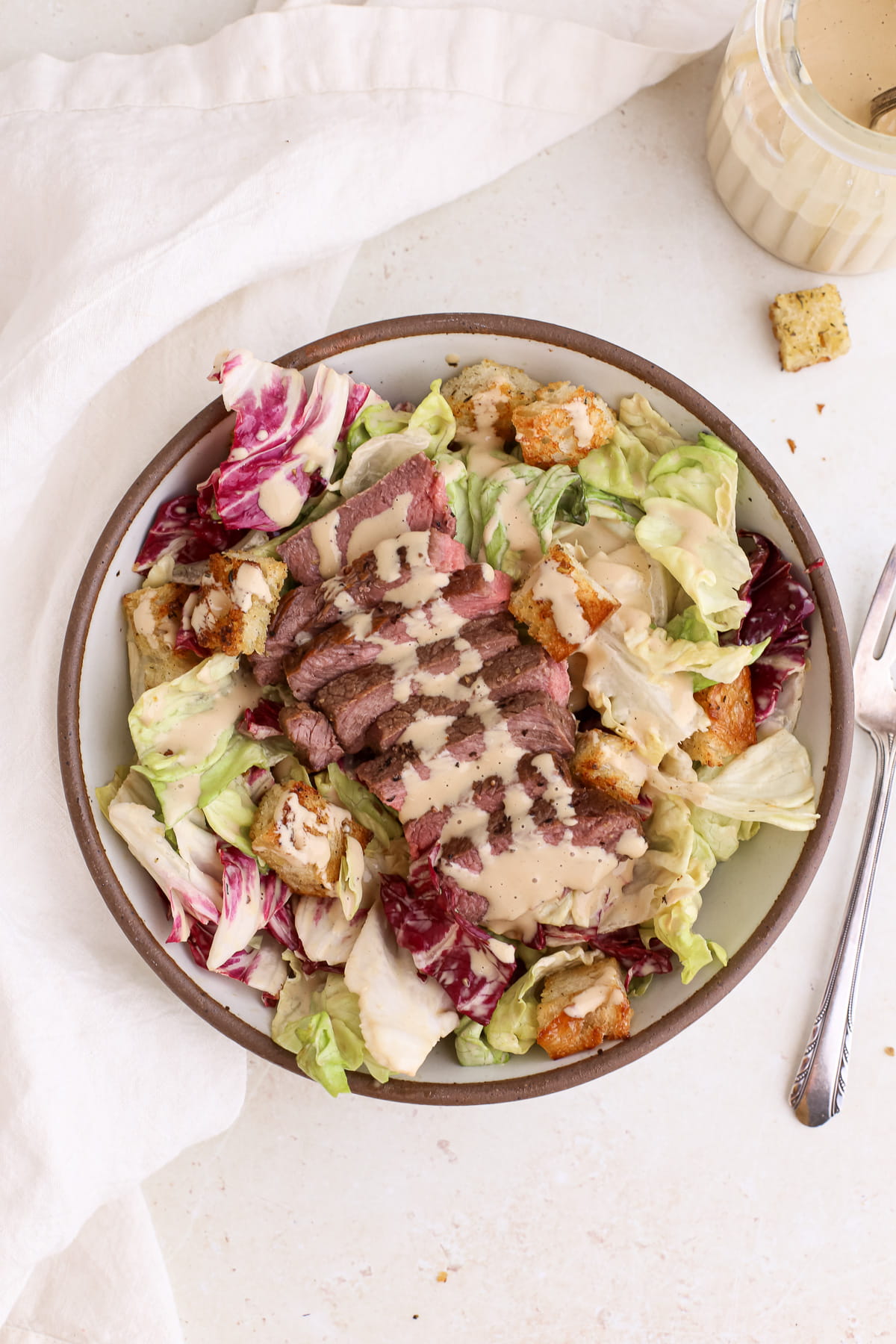 - Plate. Add the dressed lettuce and croutons to each bowl and top with sliced steak and another drizzle of dressing if desired. Enjoy!
