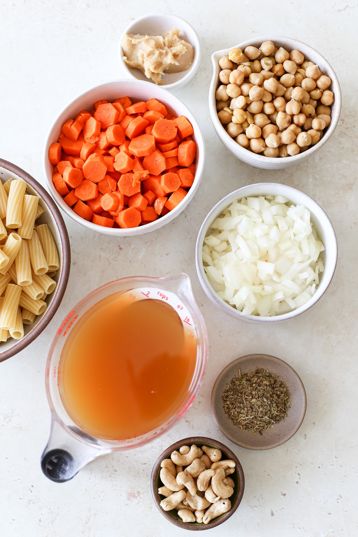 • Build the flavor. Heat olive oil in a pot over medium heat. Once warm, cook the onion and garlic until fragrant and starting to brown, about five minutes. Add in the carrot slices, raw cashews, and veggie broth, and bring to a boil.